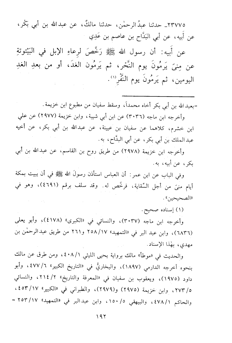 ٢٣٧٧٥ - حَدَّثَنَا عَبْدُ الرَّحْمَنِ، حَدَّثَنَا مَالِكٌ، عَنْ عَبْدِ اللهِ بْنِ أَبِي بَكْرٍ، عَنْ أَبِيهِ، عَنْ أَبِي الْبَدَّاحِ بْنِ عَاصِمِ بْنِ عَدِيٍّ، عَنْ أَبِيهِ: " أَنَّ رَسُولَ اللهِ صَلَّى اللهُ عَلَيْهِ وَسَلَّمَ رَخَّصَ لِرِعَاءِ الْإِبِلِ فِي الْبَيْتُوتَةِ عَنْ مِنًى يَرْمُونَ يَوْمَ النَّحْرِ، ثُمَّ يَرْمُونَ الْغَدَ، أَوْ مِنْ بَعْدِ الْغَدِ الْيَوْمَيْنِ، ثُمَّ يَرْمُونَ يَوْمَ النَّفْرِ " (١)