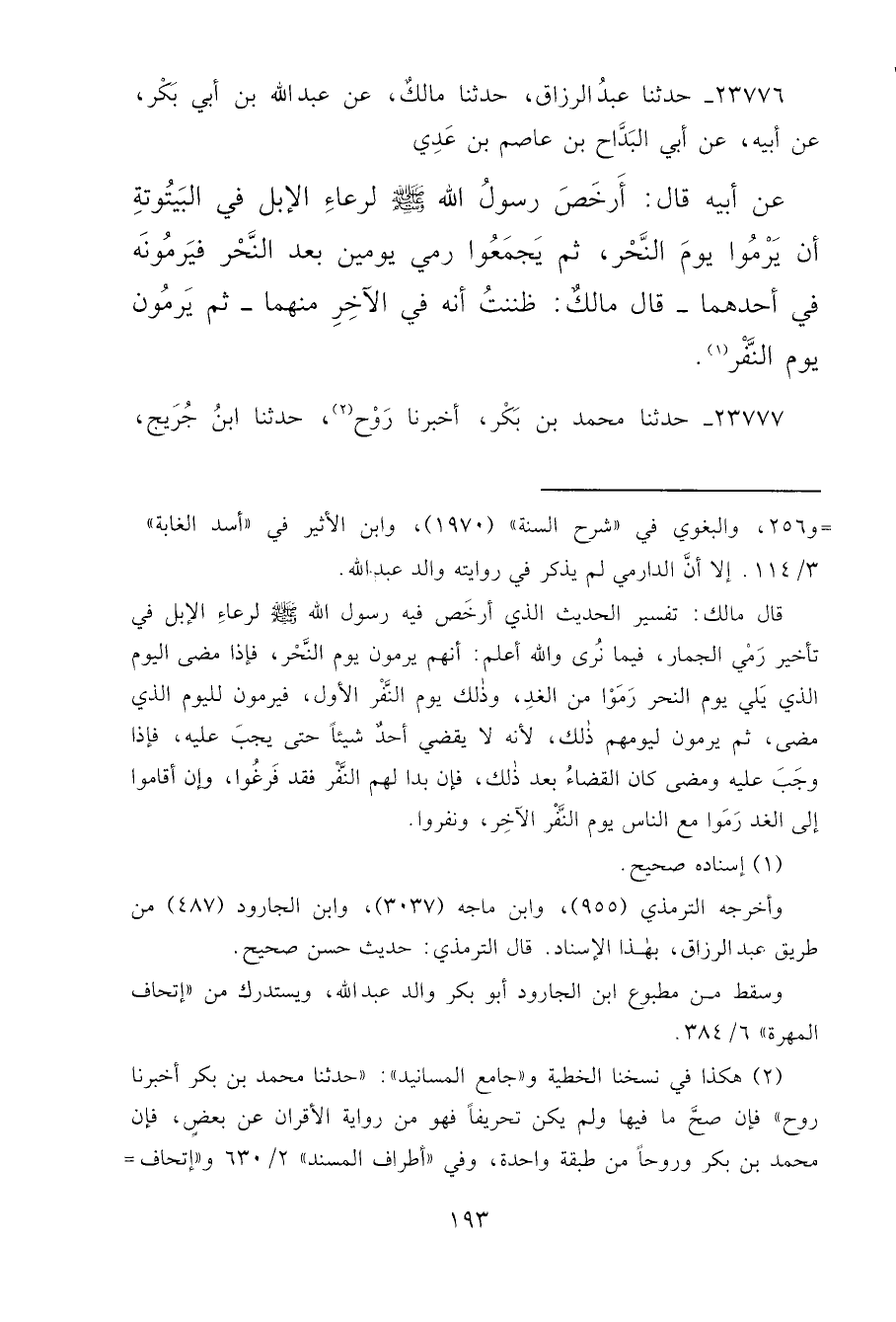 ٢٣٧٧٦ - حَدَّثَنَا عَبْدُ الرَّزَّاقِ، حَدَّثَنَا مَالِكٌ، عَنْ عَبْدِ اللهِ بْنِ أَبِي بَكْرٍ، عَنْ أَبِيهِ، عَنْ أَبِي الْبَدَّاحِ بْنِ عَاصِمِ بْنِ عَدِيٍّ، عَنْ أَبِيهِ قَالَ: " أَرْخَصَ رَسُولُ اللهِ صَلَّى اللهُ عَلَيْهِ وَسَلَّمَ لِرِعَاءِ الْإِبِلِ فِي الْبَيْتُوتَةِ أَنْ يَرْمُوا يَوْمَ النَّحْرِ، ثُمَّ يَجْمَعُوا رَمْيَ يَوْمَيْنِ بَعْدَ النَّحْرِ، فَيَرْمُونَهُ فِي أَحَدِهِمَا "، قَالَ مَالِكٌ: ظَنَنْتُ أَنَّهُ فِي الْآخِرِ مِنْهُمَا، ثُمَّ يَرْمُونَ يَوْمَ النَّفْرِ (١)