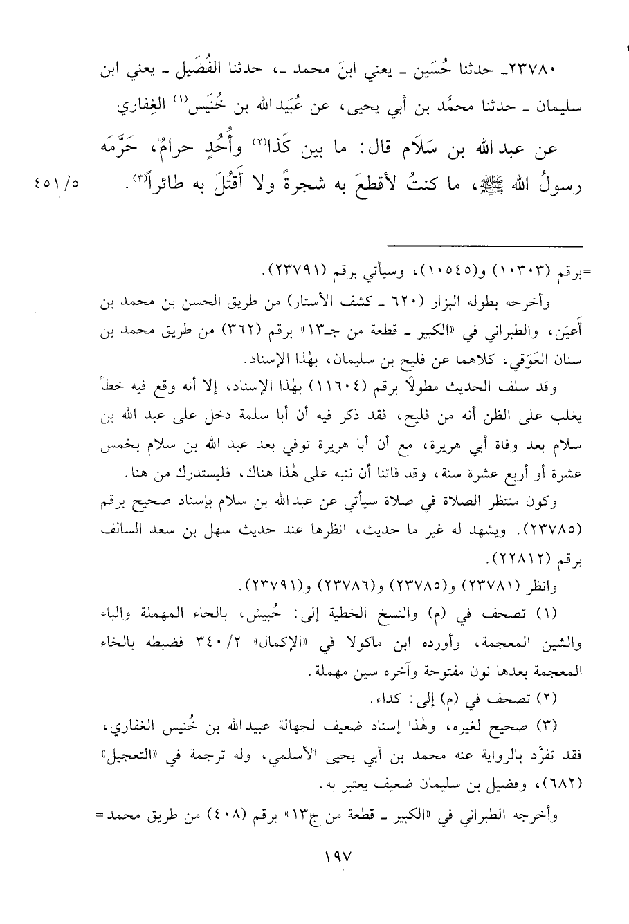 ٢٣٧٨٠ - حَدَّثَنَا حُسَيْنٌ يَعْنِي ابْنَ مُحَمَّدٍ، حَدَّثَنَا الْفُضَيْلُ يَعْنِي ابْنَ سُلَيْمَانَ، حَدَّثَنَا مُحَمَّدُ بْنُ أَبِي يَحْيَى، عَنْ عُبَيْدِ اللهِ بْنِ خُنَيْسٍ (١) الْغِفَارِيِّ، عَنْ عَبْدِ اللهِ بْنِ سَلَامٍ، قَالَ: " مَا بَيْنَ كَذَا (٢) ، وَأُحُدٍ حَرَامٌ، حَرَّمَهُ رَسُولُ اللهِ صَلَّى اللهُ عَلَيْهِ وَسَلَّمَ، مَا كُنْتُ لِأَقْطَعَ بِهِ شَجَرَةً وَلَا أَقْتُلَ بِهِ طَائِرًا " (٣)