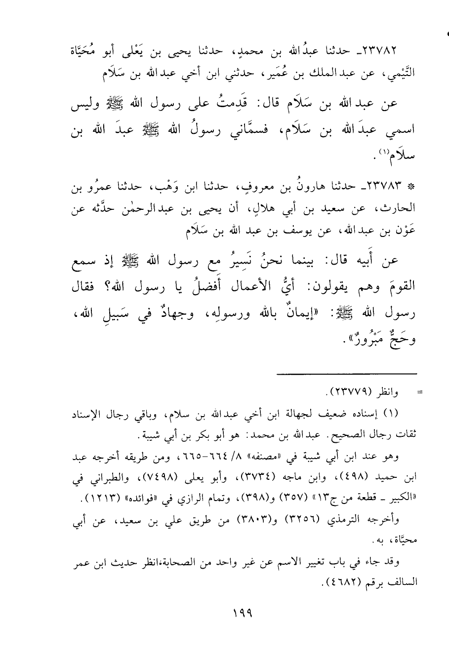 * ٢٣٧٨٣ - حَدَّثَنَا هَارُونُ بْنُ مَعْرُوفٍ، حَدَّثَنَا ابْنُ وَهْبٍ، حَدَّثَنَا عَمْرُو بْنُ الْحَارِثِ، عَنْ سَعِيدِ بْنِ أَبِي هِلَالٍ، أَنَّ يَحْيَى بْنَ عَبْدِ الرَّحْمَنِ، حَدَّثَهُ عَنْ عَوْنِ بْنِ عَبْدِ اللهِ، عَنْ يُوسُفَ بْنِ عَبْدِ اللهِ بْنِ سَلَامٍ، عَنْ أَبِيهِ، قَالَ: بَيْنَمَا نَحْنُ نَسِيرُ مَعَ رَسُولِ اللهِ صَلَّى اللهُ عَلَيْهِ وَسَلَّمَ إِذْ سَمِعَ الْقَوْمَ وَهُمْ يَقُولُونَ: أَيُّ الْأَعْمَالِ أَفْضَلُ يَا رَسُولَ اللهِ؟ فَقَالَ رَسُولُ اللهِ صَلَّى اللهُ عَلَيْهِ وَسَلَّمَ: " إِيمَانٌ بِاللهِ وَرَسُولِهِ، وَجِهَادٌ فِي سَبِيلِ اللهِ، وَحَجٌّ مَبْرُورٌ "،