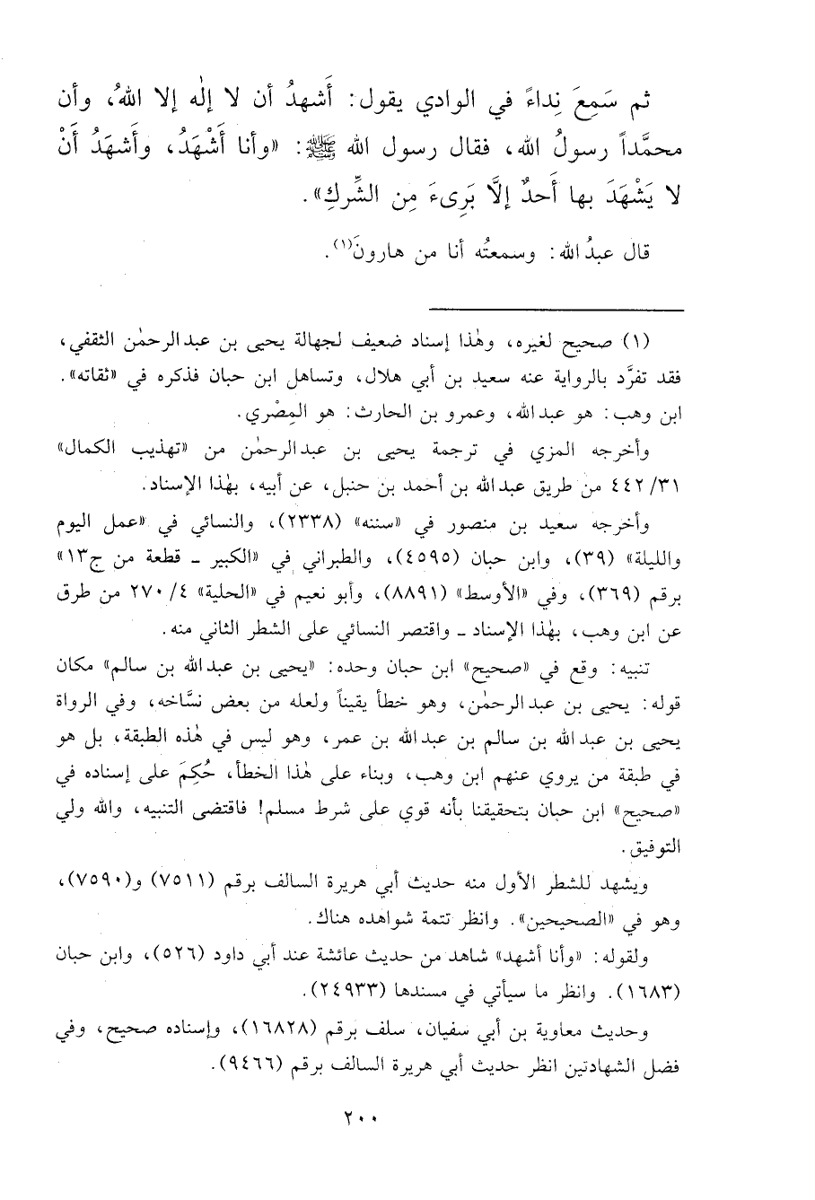 ثُمَّ سَمِعَ نِدَاءً فِي الْوَادِي يَقُولُ: أَشْهَدُ أَنْ لَا إِلَهَ إِلَّا اللهُ، وَأَنَّ مُحَمَّدًا رَسُولُ اللهِ، فَقَالَ رَسُولُ اللهِ صَلَّى اللهُ عَلَيْهِ وَسَلَّمَ: " وَأَنَا أَشْهَدُ، وَأَشْهَدُ أَنْ لَا يَشْهَدَ بِهَا أَحَدٌ إِلَّا بَرِئَ مِنَ الشِّرْكِ " قَالَ عَبْدُ اللهِ: وَسَمِعْتُهُ أَنَا مِنْ هَارُونَ (١)