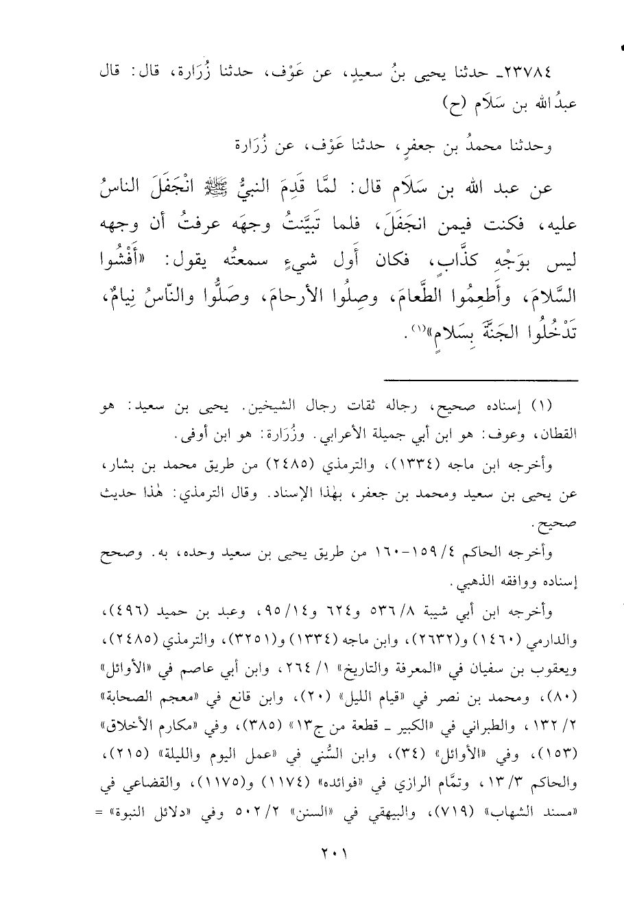 ٢٣٧٨٤ - حَدَّثَنَا يَحْيَى بْنُ سَعِيدٍ، عَنْ عَوْفٍ، حَدَّثَنَا زُرَارَةُ، قَالَ: قَالَ عَبْدُ اللهِ بْنُ سَلَامٍ ح، وحَدَّثَنَا مُحَمَّدُ بْنُ جَعْفَرٍ، حَدَّثَنَا عَوْفٌ، عَنْ زُرَارَةَ، عَنْ عَبْدِ اللهِ بْنِ سَلَامٍ، قَالَ: لَمَّا قَدِمَ النَّبِيُّ صَلَّى اللهُ عَلَيْهِ وَسَلَّمَ انْجَفَلَ النَّاسُ عَلَيْهِ، فَكُنْتُ فِيمَنِ انْجَفَلَ، فَلَمَّا تَبَيَّنْتُ وَجْهَهُ عَرَفْتُ أَنَّ وَجْهَهُ لَيْسَ بِوَجْهِ كَذَّابٍ، فَكَانَ أَوَّلُ شَيْءٍ سَمِعْتُهُ يَقُولُ: " أَفْشُوا السَّلَامَ، وَأَطْعِمُوا الطَّعَامَ، وَصِلُوا الْأَرْحَامَ، وَصَلُّوا وَالنَّاسُ نِيَامٌ تَدْخُلُوا الْجَنَّةَ بِسَلَامٍ " (١)