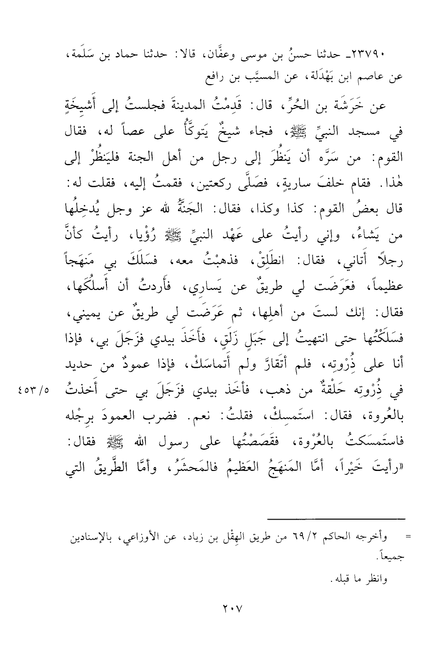 ٢٣٧٩٠ - حَدَّثَنَا حَسَنُ بْنُ مُوسَى، وَعَفَّانُ، قَالَا: حَدَّثَنَا حَمَّادُ بْنُ سَلَمَةَ، عَنْ عَاصِمِ ابْنِ بَهْدَلَةَ، عَنِ الْمُسَيَّبِ بْنِ رَافِعٍ، عَنْ خَرَشَةَ بْنِ الْحُرِّ، قَالَ: قَدِمْتُ الْمَدِينَةَ فَجَلَسْتُ إِلَى شِيَخَةٍ فِي مَسْجِدِ النَّبِيِّ صَلَّى اللهُ عَلَيْهِ وَسَلَّمَ فَجَاءَ شَيْخٌ يَتَوَكَّأُ عَلَى عَصًا لَهُ، فَقَالَ الْقَوْمُ: مَنْ سَرَّهُ أَنْ يَنْظُرَ إِلَى رَجُلٍ مِنْ أَهْلِ الْجَنَّةِ فَلْيَنْظُرْ إِلَى هَذَا، فَقَامَ خَلْفَ سَارِيَةٍ فَصَلَّى رَكْعَتَيْنِ، فَقُمْتُ إِلَيْهِ فَقُلْتُ لَهُ: قَالَ بَعْضُ الْقَوْمِ كَذَا وَكَذَا فَقَالَ: الْجَنَّةُ لِلَّهِ عَزَّ وَجَلَّ يُدْخِلُهَا مَنْ يَشَاءُ، وَإِنِّي رَأَيْتُ عَلَى عَهْدِ النَّبِيِّ صَلَّى اللهُ عَلَيْهِ وَسَلَّمَ رُؤْيَا، رَأَيْتُ كَأَنَّ رَجُلًا أَتَانِي، فَقَالَ: انْطَلِقْ، فَذَهَبْتُ مَعَهُ، فَسَلَكَ بِي مَنْهَجًا عَظِيمًا، فَعَرَضَتْ لِي طَرِيقٌ عَنْ يَسَارِي، فَأَرَدْتُ أَنْ أَسْلُكَهَا، فَقَالَ: إِنَّكَ لَسْتَ مِنْ أَهْلِهَا، ثُمَّ عَرَضَتْ لِي طَرِيقٌ عَنْ يَمِينِي، فَسَلَكْتُهَا حَتَّى انْتَهَيْتُ إِلَى جَبَلٍ زَلِقٍ، فَأَخَذَ بِيَدِي فَزَجَلَ بِي، فَإِذَا أَنَا عَلَى ذُرْوَتِهِ، فَلَمْ أَتَقَارَّ وَلَا أَتَمَاسَكْ، فَإِذَا عَمُودٌ مِنْ حَدِيدٍ فِي ذُرْوَتِهِ حَلْقَةٌ مِنْ ذَهَبٍ، فَأَخَذَ بِيَدِي فَزَجَلَ بِي حَتَّى أَخَذْتُ بِالْعُرْوَةِ، فَقَالَ: اسْتَمْسِكْ، فَقُلْتُ: نَعَمْ، فَضَرَبَ الْعَمُودَ بِرِجْلِهِ فَاسْتَمْسَكْتُ بِالْعُرْوَةِ، فَقَصَصْتُهَا عَلَى رَسُولِ اللهِ صَلَّى اللهُ عَلَيْهِ وَسَلَّمَ، فَقَالَ: " رَأَيْتَ خَيْرًا أَمَّا الْمَنْهَجُ الْعَظِيمُ فَالْمَحْشَرُ، وَأَمَّا الطَّرِيقُ الَّتِي