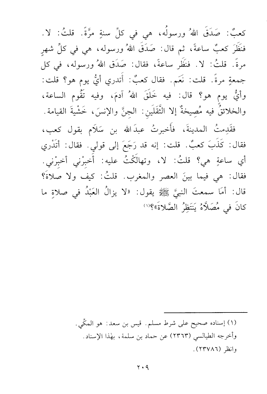 كَعْبٌ: صَدَقَ اللهُ وَرَسُولُهُ هِيَ فِي كُلِّ سَنَةٍ مَرَّةٌ قُلْتُ: لَا فَنَظَرَ كَعْبٌ سَاعَةً، ثُمَّ قَالَ: صَدَقَ اللهُ وَرَسُولُهُ هِيَ فِي كُلِّ شَهْرٍ مَرَّةٌ قُلْتُ: لَا فَنَظَرَ سَاعَةً فَقَالَ: صَدَقَ اللهُ وَرَسُولُهُ فِي كُلِّ جُمُعَةٍ مَرَّةٌ قُلْتُ: نَعَمْ، فَقَالَ كَعْبٌ: أَتَدْرِي أَيُّ يَوْمٍ هُوَ؟ قُلْتُ: وَأَيُّ يَوْمٍ هُوَ؟ قَالَ: فِيهِ خَلَقَ اللهُ آدَمَ وَفِيهِ تَقُومُ السَّاعَةُ وَالْخَلَائِقُ فِيهِ مُصِيخَةٌ إِلَّا الثَّقَلَيْنِ: الْجِنَّ وَالْإِنْسَ، خَشْيَةَ الْقِيَامَةِ، فَقَدِمْتُ الْمَدِينَةَ، فَأَخْبَرْتُ عَبْدَ اللهِ بْنَ سَلَامٍ بِقَوْلِ كَعْبٍ، فَقَالَ: كَذَبَ كَعْبٌ، قُلْتُ: إِنَّهُ قَدْ رَجَعَ إِلَى قَوْلِي، فَقَالَ: أَتَدْرِي أَيُّ سَاعَةٍ هِيَ؟ قُلْتُ: لَا، وَتَهَالَكْتُ عَلَيْهِ: أَخْبِرْنِي أَخْبِرْنِي، فَقَالَ: هِيَ فِيمَا بَيْنَ الْعَصْرِ وَالْمَغْرِبِ، قُلْتُ: كَيْفَ وَلَا صَلَاةَ؟ قَالَ: أَمَا سَمِعْتَ النَّبِيَّ صَلَّى اللهُ عَلَيْهِ وَسَلَّمَ يَقُولُ: " لَا يَزَالُ الْعَبْدُ فِي صَلَاةٍ مَا كَانَ فِي مُصَلَّاهُ يَنْتَظِرُ الصَّلَاةَ " (١)