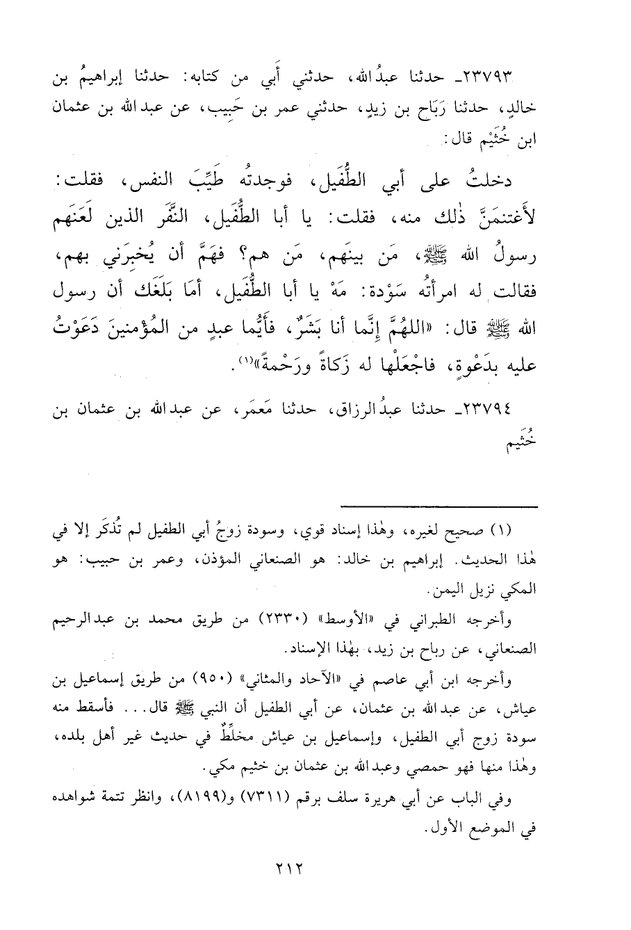 ٢٣٧٩٣ - حَدَّثَنَا عَبْدُ اللهِ، حَدَّثَنِي أَبِي مِنْ، كِتَابِهِ: حَدَّثَنَا إِبْرَاهِيمُ بْنُ خَالِدٍ، حَدَّثَنَا رَبَاحُ بْنُ زَيْدٍ، حَدَّثَنِي عُمَرُ بْنُ حَبِيبٍ، عَنْ عَبْدِ اللهِ بْنِ عُثْمَانَ بْنِ خُثَيْمٍ، قَالَ: دَخَلْتُ عَلَى أَبِي الطُّفَيْلِ، فَوَجَدْتُهُ طَيِّبَ النَّفْسِ، فَقُلْتُ: لَأَغْتَنِمَنَّ ذَلِكَ مِنْهُ، فَقُلْتُ: يَا أَبَا الطُّفَيْلِ، النَّفَرُ الَّذِينَ لَعَنَهُمْ رَسُولُ اللهِ صَلَّى اللهُ عَلَيْهِ وَسَلَّمَ، مِنْ بَيْنِهِمْ، مَنْ هُمْ؟ فَهَمَّ أَنْ يُخْبِرَنِي بِهِمْ، فَقَالَتْ لَهُ امْرَأَةٌ سَوْدَاءُ: مَهْ يَا أَبَا الطُّفَيْلِ، أَمَا بَلَغَكَ أَنَّ رَسُولَ اللهِ صَلَّى اللهُ عَلَيْهِ وَسَلَّمَ قَالَ: " اللهُمَّ إِنَّمَا أَنَا بَشَرٌ، فَأَيُّمَا عَبْدٍ مِنَ الْمُؤْمِنِينَ دَعَوْتُ عَلَيْهِ بِدَعْوَةٍ، فَاجْعَلْهَا لَهُ زَكَاةً وَرَحْمَةً " (١)