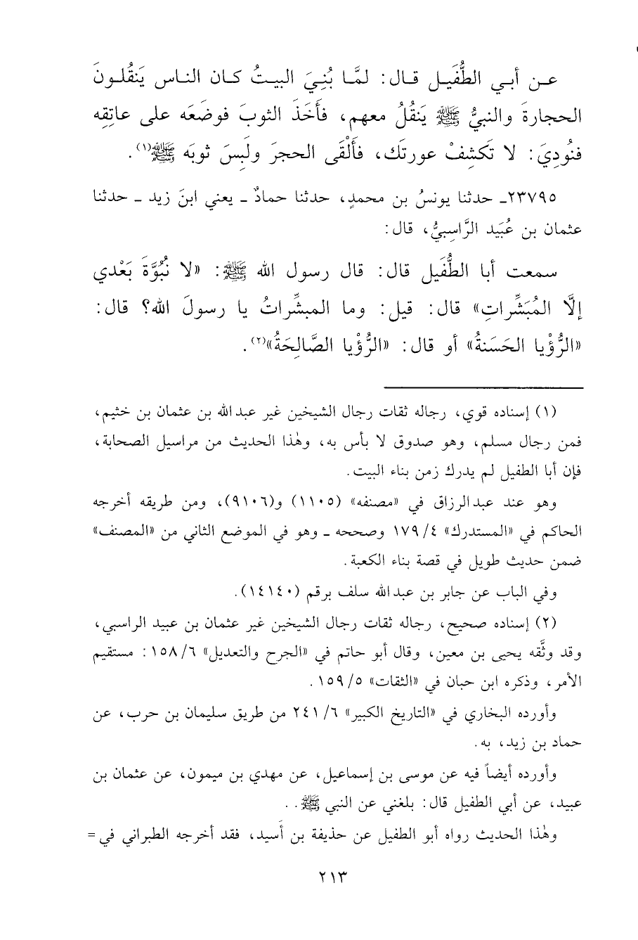 ٢٣٧٩٥ - حَدَّثَنَا يُونُسُ بْنُ مُحَمَّدٍ، حَدَّثَنَا حَمَّادٌ يَعْنِي ابْنَ زَيْدٍ، حَدَّثَنَا عُثْمَانُ بْنُ عُبَيْدٍ الرَّاسِبِيُّ، قَالَ: سَمِعْتُ أَبَا الطُّفَيْلِ، قَالَ: قَالَ رَسُولُ اللهِ صَلَّى اللهُ عَلَيْهِ وَسَلَّمَ: " لَا نُبُوَّةَ بَعْدِي إِلَّا الْمُبَشِّرَاتِ "، قَالَ: قِيلَ: وَمَا الْمُبَشِّرَاتُ يَا رَسُولَ اللهِ؟، قَالَ: " الرُّؤْيَا الْحَسَنَةُ " أَوْ قَالَ: " الرُّؤْيَا الصَّالِحَةُ " (٢)