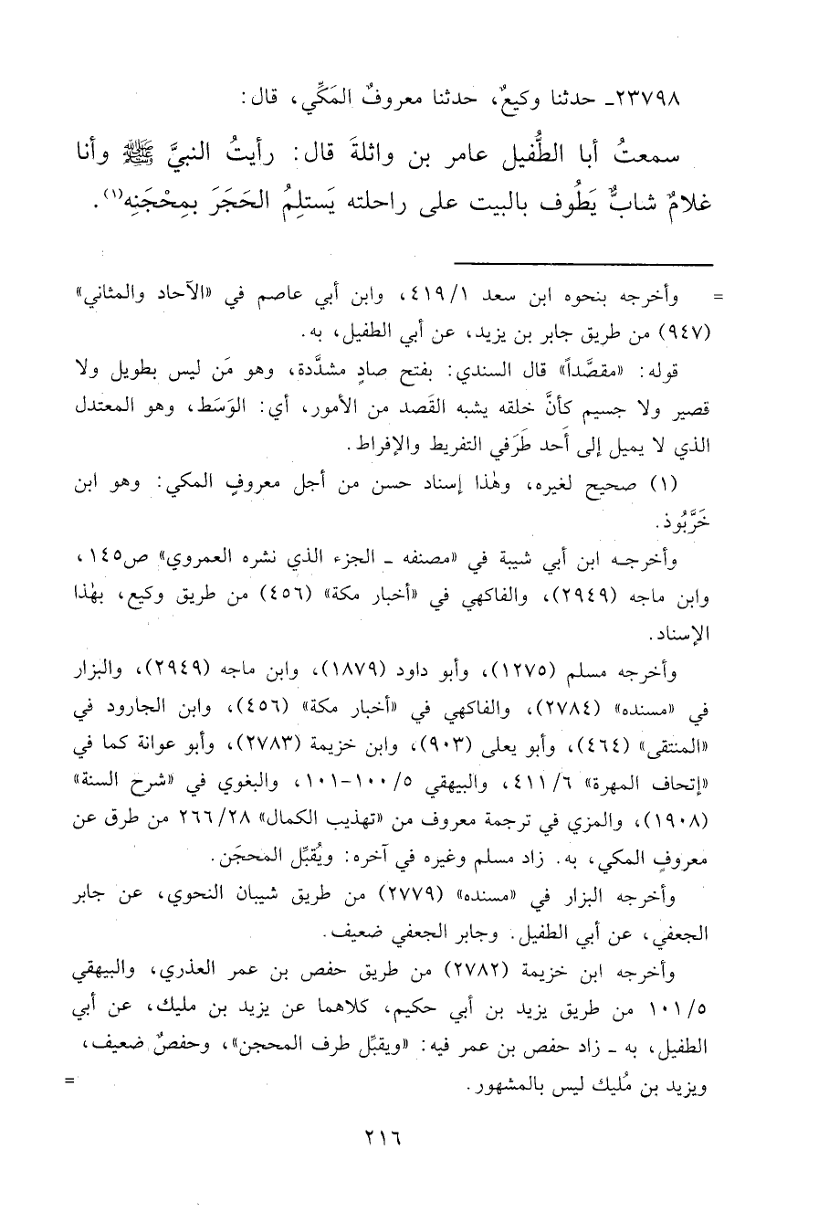 ٢٣٧٩٨ - حَدَّثَنَا وَكِيعٌ، حَدَّثَنَا مَعْرُوفٌ الْمَكِّيُّ، قَالَ: سَمِعْتُ أَبَا الطُّفَيْلِ عَامِرَ بْنَ وَاثِلَةَ، قَالَ: " رَأَيْتُ النَّبِيَّ صَلَّى اللهُ عَلَيْهِ وَسَلَّمَ، وَأَنَا غُلَامٌ شَابٌّ، يَطُوفُ بِالْبَيْتِ عَلَى رَاحِلَتِهِ يَسْتَلِمُ الْحَجَرَ بِمِحْجَنِهِ " (١)