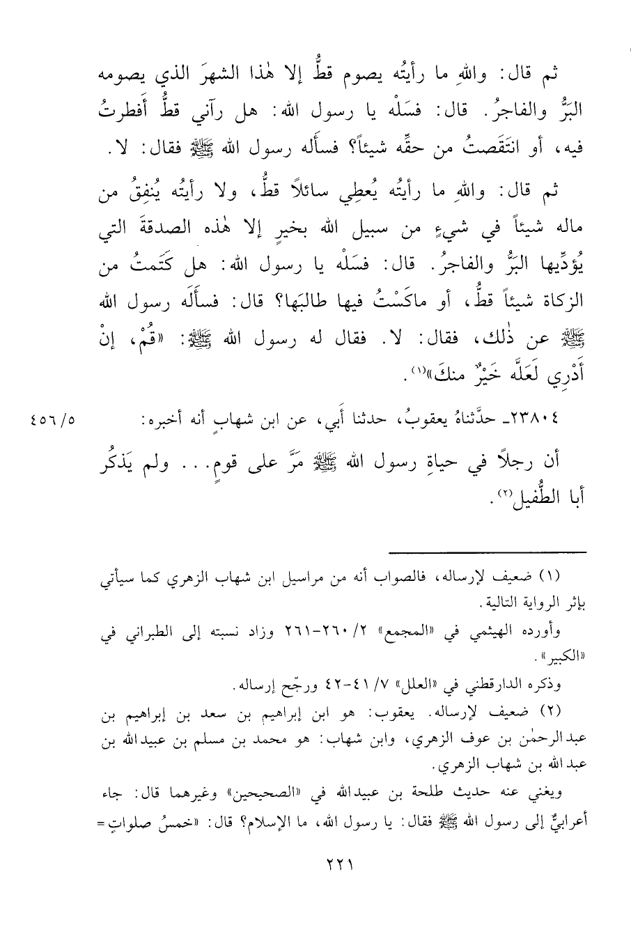 ٢٣٨٠٤ - حَدَّثَنَاهُ يَعْقُوبُ، حَدَّثَنَا أَبِي، عَنِ ابْنِ شِهَابٍ، أَنَّهُ أَخْبَرَهُ أَنَّ رَجُلًا فِي حَيَاةِ رَسُولِ اللهِ صَلَّى اللهُ عَلَيْهِ وَسَلَّمَ مَرَّ عَلَى قَوْمٍ وَلَمْ يَذْكُرْ أَبَا الطُّفَيْلِ. (٢)