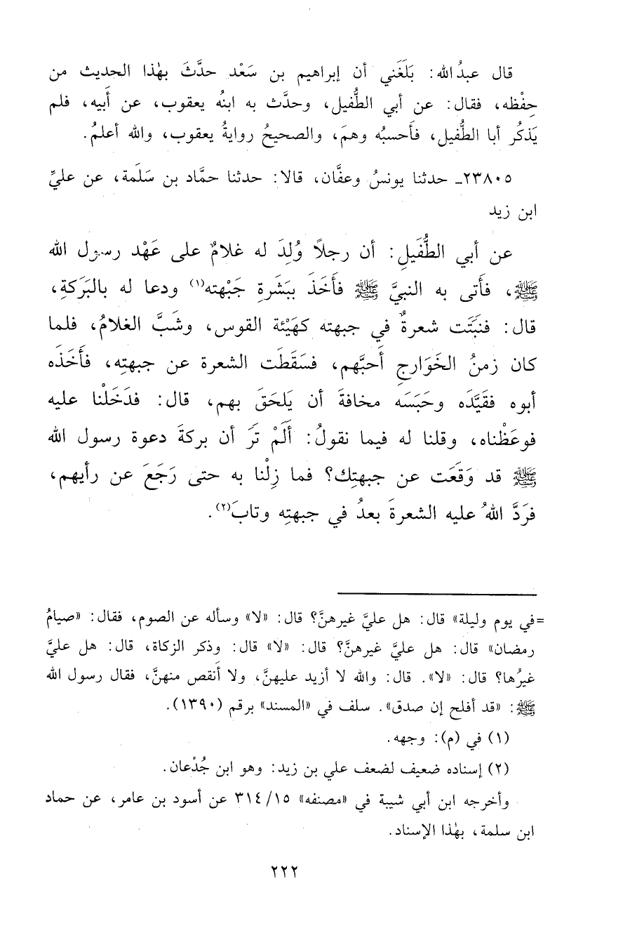 ٢٣٨٠٥ - حَدَّثَنَا يُونُسُ، وَعَفَّانُ قَالَا: حَدَّثَنَا حَمَّادُ بْنُ سَلَمَةَ، عَنْ عَلِيِّ بْنِ زَيْدٍ، عَنْ أَبِي الطُّفَيْلِ: أَنَّ رَجُلًا وُلِدَ لَهُ غُلَامٌ عَلَى عَهْدِ رَسُولِ اللهِ صَلَّى اللهُ عَلَيْهِ وَسَلَّمَ، فَأَتَى بِهِ النَّبِيَّ صَلَّى اللهُ عَلَيْهِ وَسَلَّمَ " فَأَخَذَ بِبَشَرَةِ جَبْهَتِهِ (١) وَدَعَا لَهُ بِالْبَرَكَةِ " قَالَ: فَنَبَتَتْ شَعَرَةٌ فِي جَبْهَتِهِ كَهَيْئَةِ الْقَوْسِ، وَشَبَّ الْغُلَامُ، فَلَمَّا كَانَ زَمَنُ الْخَوَارِجِ أَحَبَّهُمْ، فَسَقَطَتِ الشَّعَرَةُ عَنْ جَبْهَتِهِ، فَأَخَذَهُ أَبُوهُ فَقَيَّدَهُ وَحَبَسَهُ، مَخَافَةَ أَنْ يَلْحَقَ بِهِمْ، قَالَ: فَدَخَلْنَا عَلَيْهِ فَوَعَظْنَاهُ، وَقُلْنَا لَهُ فِيمَا نَقُولُ: أَلَمْ تَرَ أَنَّ بَرَكَةَ دَعْوَةِ رَسُولِ اللهِ صَلَّى اللهُ عَلَيْهِ وَسَلَّمَ قَدْ وَقَعَتْ عَنْ جَبْهَتِكَ؟ فَمَا زِلْنَا بِهِ حَتَّى رَجَعَ عَنْ رَأْيِهِمْ، فَرَدَّ اللهُ عَلَيْهِ الشَّعَرَةَ بَعْدُ فِي جَبْهَتِهِ وَتَابَ (٢)