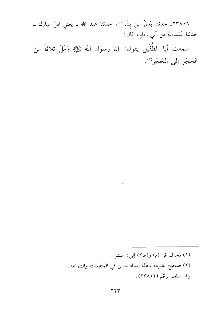 ٢٣٨٠٦ - حَدَّثَنَا يَعْمَرُ بْنُ بِشْرٍ (١) ، حَدَّثَنَا عَبْدُ اللهِ يَعْنِي ابْنَ مُبَارَكٍ، حَدَّثَنَا عُبَيْدُ اللهِ بْنُ أَبِي زِيَادٍ، قَالَ: سَمِعْتُ أَبَا الطُّفَيْلِ، يَقُولُ: " إِنَّ رَسُولَ اللهِ صَلَّى اللهُ عَلَيْهِ وَسَلَّمَ رَمَلَ ثَلَاثًا مِنَ الْحَجَرِ إِلَى الْحَجَرِ " (٢)