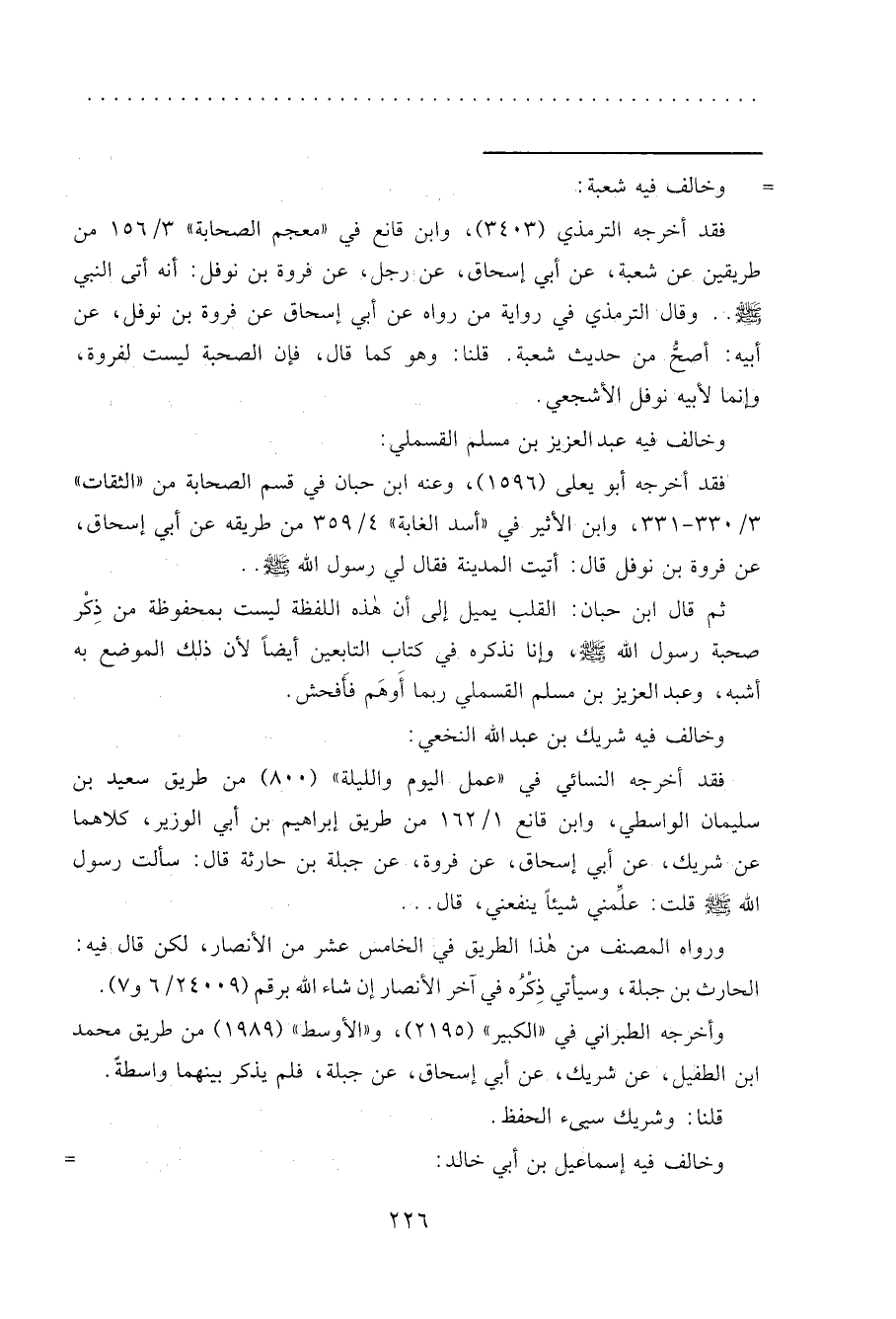 فقد أخرجه الترمذي (٣٤٠٣) ، وابن قانع في "معجم الصحابة" ٣/١٥٦ من طريقين عن شعبة، عن أبي إسحاق، عن رجل، عن فروة بن نوفل: أنه أتى النبي صَلَّى اللهُ عَلَيْهِ وَسَلَّمَ.. وقال الترمذي في رواية من رواه عن أبي إسحاق عن فروة بن نوفل، عن أبيه: أصح من حديث شعبة. قلنا: وهو كما قال، فإن الصحبة ليست لفروة، وإنما لأبيه نوفل الأشجعي،
