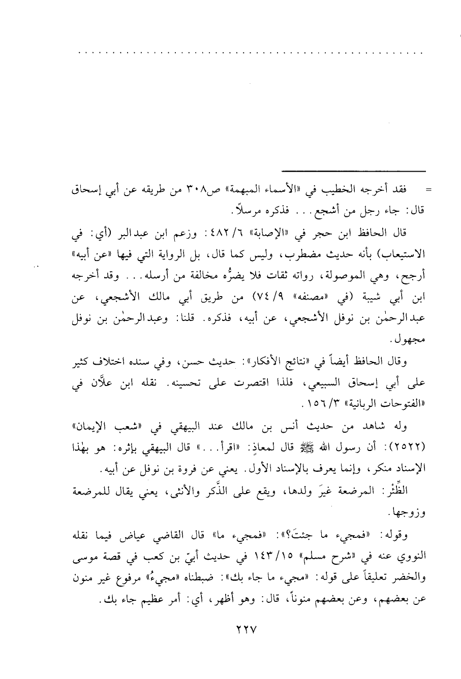قال الحافظ ابن حجر في "الإصابة" ٦/٤٨٢: وزعم ابن عبد البر (أي: في الاستيعاب) بأنه حديث مضطرب، وليس كما قال، بل الرواية التى فيها "عن أبيه" أرجح، وهي الموصولة، رواته ثقات فلا يضرُّه مخالفة من أرسله ... وقد أخرجه ابن أبي شيبة (في "مصنفه" ٩/٧٤) من طريق أبي مالك الأشجعي، عن عبد الرحمن بن نوفل الأشجعي، عن أبيه، فذكره. قلنا: وعبد الرحمن بن نوفل مجهول.