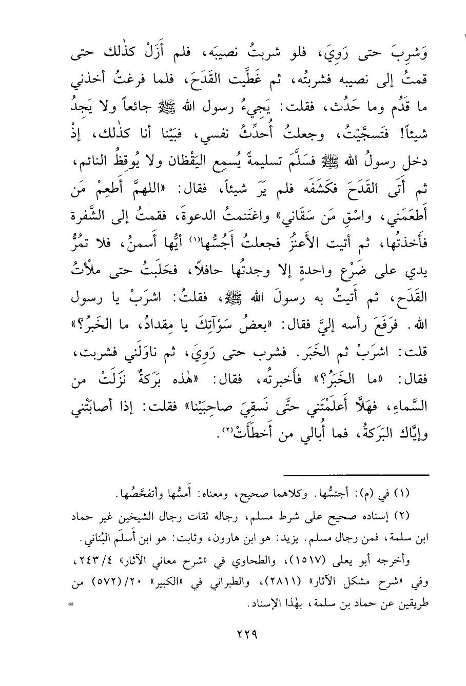 وَشَرِبَ حَتَّى رَوِيَ، فَلَوْ شَرِبْتُ نَصِيبَهُ، فَلَمْ أَزَلْ كَذَلِكَ حَتَّى قُمْتُ إِلَى نَصِيبِهِ فَشَرِبْتُهُ، ثُمَّ غَطَّيْتُ الْقَدَحَ، فَلَمَّا فَرَغْتُ أَخَذَنِي مَا قَدُمَ وَمَا حَدُثَ، فَقُلْتُ: يَجِيءُ رَسُولُ اللهِ صَلَّى اللهُ عَلَيْهِ وَسَلَّمَ جَائِعًا وَلَا يَجِدُ شَيْئًا فَتَسَجَّيْتُ، وَجَعَلْتُ أُحَدِّثُ نَفْسِي، فَبَيْنَا أَنَا كَذَلِكَ، إِذْ دَخَلَ رَسُولُ اللهِ صَلَّى اللهُ عَلَيْهِ وَسَلَّمَ فَسَلَّمَ تَسْلِيمَةً يُسْمِعُ الْيَقْظَانَ، وَلَا يُوقِظُ النَّائِمَ، ثُمَّ أَتَى الْقَدَحَ فَكَشَفَهُ فَلَمْ يَرَ شَيْئًا فَقَالَ: " اللهُمَّ أَطْعِمْ مَنْ أَطْعَمَنِي، وَاسْقِ مَنْ سَقَانِي "، وَاغْتَنَمْتُ الدَّعْوَةَ، فَقُمْتُ إِلَى الشَّفْرَةِ فَأَخَذْتُهَا، ثُمَّ أَتَيْتُ الْأَعْنُزَ فَجَعَلْتُ أَجَسُّهَا (١) أَيُّهَا أَسْمَنُ، فَلَا تَمُرُّ يَدَيَّ عَلَى ضَرْعِ وَاحِدَةٍ إِلَّا وَجَدْتُهَا حَافِلًا، فَحَلَبْتُ حَتَّى مَلَأْتُ الْقَدَحَ، ثُمَّ أَتَيْتُ بِهِ رَسُولَ اللهِ صَلَّى اللهُ عَلَيْهِ وَسَلَّمَ فَقُلْتُ: اشْرَبْ يَا رَسُولَ اللهِ، فَرَفَعَ رَأْسَهُ إِلَيَّ فَقَالَ: " بَعْضُ سَوْآتِكَ يَا مِقْدَادُ، مَا الْخَبَرُ؟ " قُلْتُ: اشْرَبْ، ثُمَّ الْخَبَرَ، فَشَرِبَ حَتَّى رَوِيَ، ثُمَّ نَاوَلَنِي فَشَرِبْتُ، فَقَالَ: " مَا الْخَبَرُ؟ " فَأَخْبَرْتُهُ فَقَالَ: " هَذِهِ بَرَكَةٌ نَزَلَتْ مِنَ السَّمَاءِ، فَهَلَّا أَعْلَمْتَنِي حَتَّى نَسْقِيَ صَاحِبَيْنَا " فَقُلْتُ: إِذَا أَصَابَتْنِي وَإِيَّاكَ الْبَرَكَةُ فَمَا أُبَالِي مَنْ أَخْطَأَتْ (٢)