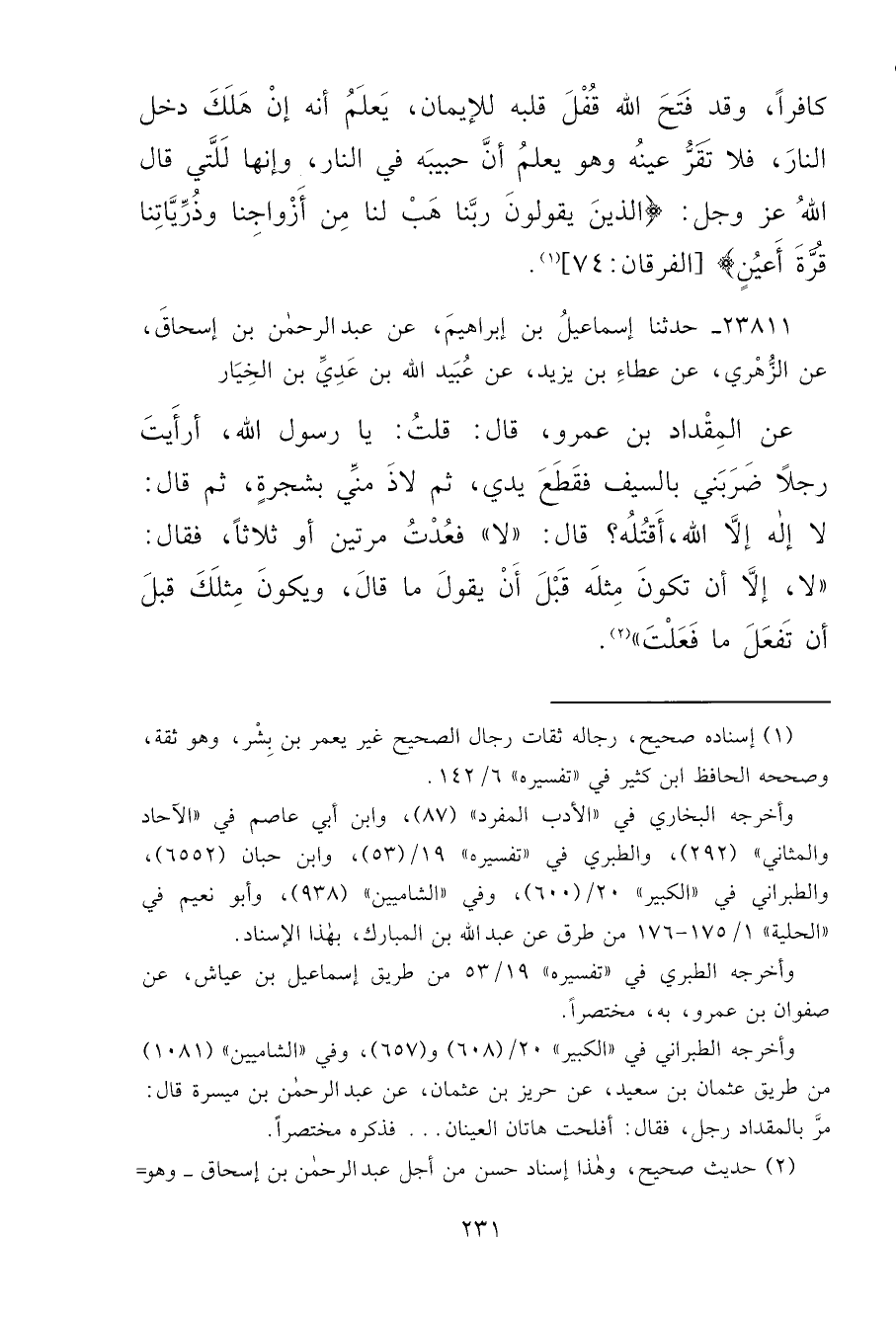 ٢٣٨١١ - حَدَّثَنَا إِسْمَاعِيلُ بْنُ إِبْرَاهِيمَ، عَنْ عَبْدِ الرَّحْمَنِ بْنِ إِسْحَاقَ، عَنِ الزُّهْرِيِّ، عَنْ عَطَاءِ بْنِ يَزِيدَ، عَنْ عُبَيْدِ اللهِ بْنِ عَدِيِّ بْنِ الْخِيَارِ، عَنِ الْمِقْدَادِ بْنِ عَمْرٍو، قَالَ: قُلْتُ: يَا رَسُولَ اللهِ أَرَأَيْتَ رَجُلًا ضَرَبَنِي بِالسَّيْفِ، فَقَطَعَ يَدِي، ثُمَّ لَاذَ مِنِّي بِشَجَرَةٍ، ثُمَّ قَالَ: لَا إِلَهَ إِلَّا اللهُ، أَقْتُلُهُ؟ قَالَ: " لَا " فَعُدْتُ مَرَّتَيْنِ أَوْ ثَلَاثًا فَقَالَ: " لَا إِلَّا أَنْ تَكُونَ مِثْلَهُ قَبْلَ أَنْ يَقُولَ مَا قَالَ، وَيَكُونَ مِثْلَكَ قَبْلَ أَنْ تَفْعَلَ مَا فَعَلْتَ " (٢)