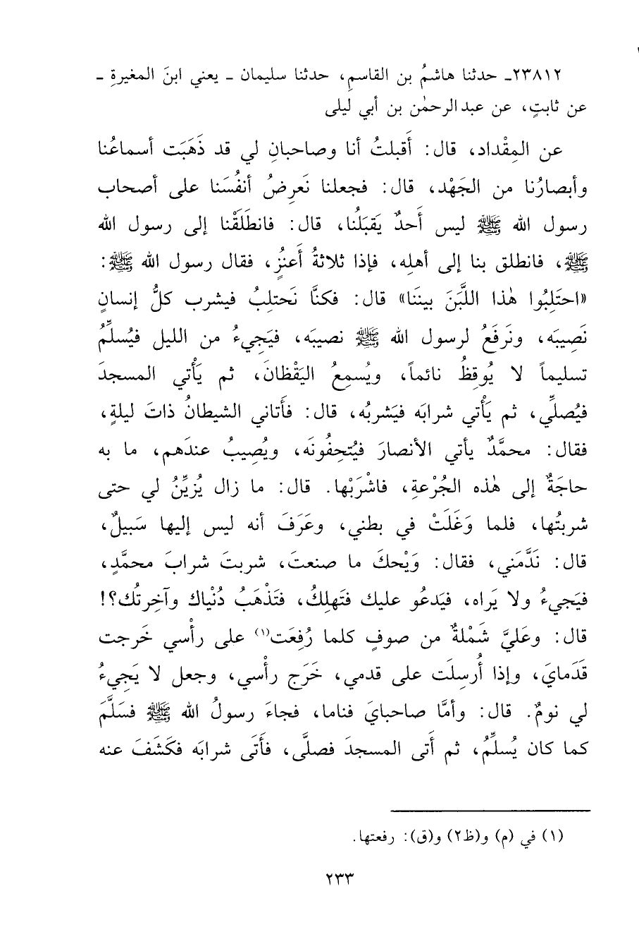 ٢٣٨١٢ - حَدَّثَنَا هَاشِمُ بْنُ الْقَاسِمِ، حَدَّثَنَا سُلَيْمَانُ يَعْنِي ابْنَ الْمُغِيرَةِ، عَنْ ثَابِتٍ، عَنْ عَبْدِ الرَّحْمَنِ بْنِ أَبِي لَيْلَى، عَنْ الْمِقْدَادِ، قَالَ: أَقْبَلْتُ أَنَا وَصَاحِبَانِ لِي قَدْ ذَهَبَتْ أَسْمَاعُنَا وَأَبْصَارُنَا مِنَ الْجَهْدِ قَالَ: فَجَعَلْنَا نَعْرِضُ أَنْفُسَنَا عَلَى أَصْحَابِ رَسُولِ اللهِ صَلَّى اللهُ عَلَيْهِ وَسَلَّمَ لَيْسَ أَحَدٌ يَقْبَلُنَا، قَالَ: فَانْطَلَقْنَا إِلَى رَسُولِ اللهِ صَلَّى اللهُ عَلَيْهِ وَسَلَّمَ، فَانْطَلَقَ بِنَا إِلَى أَهْلِهِ، فَإِذَا ثَلَاثُ أَعْنُزٍ، فَقَالَ رَسُولُ اللهِ صَلَّى اللهُ عَلَيْهِ وَسَلَّمَ: " احْتَلِبُوا هَذَا اللَّبَنَ بَيْنَنَا " قَالَ: فَكُنَّا نَحْتَلِبُ فَيَشْرَبُ كُلُّ إِنْسَانٍ نَصِيبَهُ، وَنَرْفَعُ لِرَسُولِ اللهِ صَلَّى اللهُ عَلَيْهِ وَسَلَّمَ نَصِيبَهُ، فَيَجِيءُ مِنَ اللَّيْلِ فَيُسَلِّمُ تَسْلِيمًا لَا يُوقِظُ نَائِمًا، وَيُسْمِعُ الْيَقْظَانَ، ثُمَّ يَأْتِي الْمَسْجِدَ فَيُصَلِّي، ثُمَّ يَأْتِي شَرَابَهُ فَيَشْرَبُهُ، قَالَ: فَأَتَانِي الشَّيْطَانُ ذَاتَ لَيْلَةٍ، فَقَالَ: مُحَمَّدٌ يَأْتِي الْأَنْصَارَ فَيُتْحِفُونَهُ، وَيُصِيبُ عِنْدَهُمْ مَا بِهِ حَاجَةٌ إِلَى هَذِهِ الْجُرْعَةِ، فَاشْرَبْهَا، قَالَ: مَا زَالَ يُزَيِّنُ لِي حَتَّى شَرِبْتُهَا، فَلَمَّا وَغَلَتْ فِي بَطْنِي وَعَرَفَ أَنَّهُ لَيْسَ إِلَيْهَا سَبِيلٌ، قَالَ: نَدَّمَنِي، فَقَالَ: وَيْحَكَ مَا صَنَعْتَ شَرِبْتَ شَرَابَ مُحَمَّدٍ، فَيَجِيءُ وَلَا يَرَاهُ فَيَدْعُو عَلَيْكَ فَتَهْلِكَ، فَتَذْهَبُ دُنْيَاكَ وَآخِرَتُكَ، قَالَ: وَعَلَيَّ شَمْلَةٌ مِنْ صُوفٍ كُلَّمَا رَفَعْتُ (١) عَلَى رَأْسِي خَرَجَتْ قَدَمَايَ، وَإِذَا أَرْسَلْتُ عَلَى قَدَمَيَّ خَرَجَ رَأْسِي، وَجَعَلَ لَا يَجِيءُ لِي نَوْمٌ، قَالَ: وَأَمَّا صَاحِبَايَ فَنَامَا فَجَاءَ رَسُولُ اللهِ صَلَّى اللهُ عَلَيْهِ وَسَلَّمَ فَسَلَّمَ كَمَا كَانَ يُسَلِّمُ، ثُمَّ أَتَى الْمَسْجِدَ فَصَلَّى فَأَتَى شَرَابَهُ، فَكَشَفَ عَنْهُ،