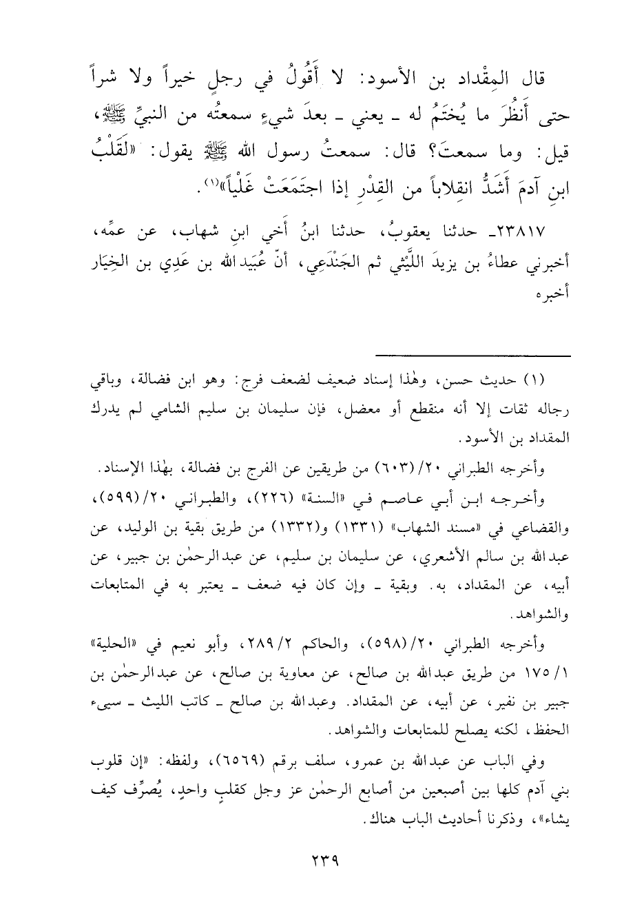 قَالَ الْمِقْدَادُ بْنُ الْأَسْوَدِ: لَا أَقُولُ فِي رَجُلٍ خَيْرًا وَلَا شَرًّا حَتَّى أَنْظُرَ مَا يُخْتَمُ لَهُ، يَعْنِي بَعَدَ شَيْءٍ سَمِعْتُهُ مِنَ النَّبِيِّ صَلَّى اللهُ عَلَيْهِ وَسَلَّمَ قِيلَ: وَمَا سَمِعْتَ؟ قَالَ: سَمِعْتُ رَسُولَ اللهِ صَلَّى اللهُ عَلَيْهِ وَسَلَّمَ يَقُولُ: " لَقَلْبُ ابْنِ آدَمَ أَشَدُّ انْقِلَابًا مِنَ الْقِدْرِ إِذَا اجْتَمَعَتْ غَلْيًا " (١)