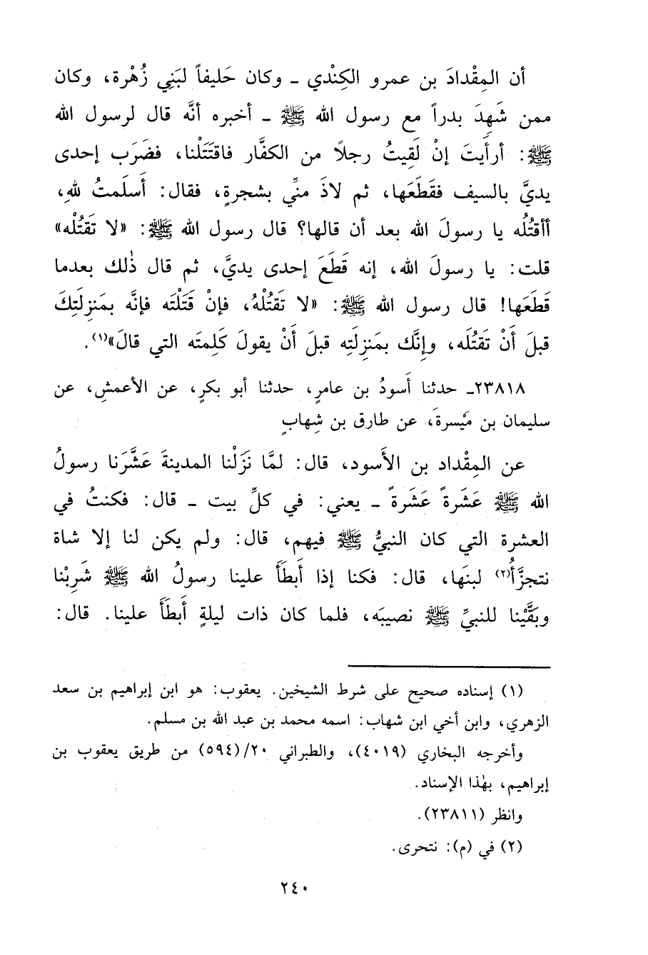 ٢٣٨١٨ - حَدَّثَنَا أَسْوَدُ بْنُ عَامِرٍ، حَدَّثَنَا أَبُو بَكْرٍ، عَنِ الْأَعْمَشِ، عَنْ سُلَيْمَانَ بْنِ مَيْسَرَةَ، عَنْ طَارِقِ بْنِ شِهَابٍ، عَنِ الْمِقْدَادِ بْنِ الْأَسْوَدِ، قَالَ: لَمَّا نَزَلْنَا الْمَدِينَةَ عَشَّرَنَا رَسُولُ اللهِ صَلَّى اللهُ عَلَيْهِ وَسَلَّمَ عَشَرَةً عَشَرَةً، يَعْنِي: فِي كُلِّ بَيْتٍ، قَالَ: فَكُنْتُ فِي الْعَشَرَةِ الَّتِي كَانَ النَّبِيُّ صَلَّى اللهُ عَلَيْهِ وَسَلَّمَ فِيهِمْ، قَالَ: وَلَمْ يَكُنْ لَنَا إِلَّا شَاةٌ نَتَجَزَّأُ (٢) لَبَنَهَا، قَالَ: فَكُنَّا إِذَا أَبْطَأَ عَلَيْنَا رَسُولُ اللهِ صَلَّى اللهُ عَلَيْهِ وَسَلَّمَ شَرِبْنَا، وَبَقَّيْنَا لِلنَّبِيِّ صَلَّى اللهُ عَلَيْهِ وَسَلَّمَ نَصِيبَهُ، فَلَمَّا كَانَ ذَاتَ لَيْلَةٍ أَبْطَأَ عَلَيْنَا، قَالَ: