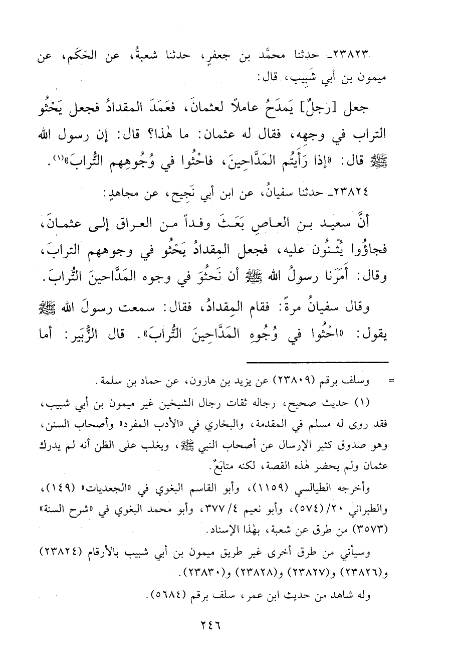 ٢٣٨٢٣ - حَدَّثَنَا مُحَمَّدُ بْنُ جَعْفَرٍ، حَدَّثَنَا شُعْبَةُ، عَنِ الْحَكَمِ، عَنْ مَيْمُونِ بْنِ أَبِي شَبِيبٍ، قَالَ: جَعَلَ رَجُلُ يَمْدَحُ عَامِلًا لِعُثْمَانَ فَعَمَدَ الْمِقْدَادُ فَجَعَلَ يَحْثُو التُّرَابَ فِي وَجْهِهِ، فَقَالَ لَهُ عُثْمَانُ: مَا هَذَا؟ قَالَ: إِنَّ رَسُولَ اللهِ صَلَّى اللهُ عَلَيْهِ وَسَلَّمَ قَالَ: " إِذَا رَأَيْتُمُ الْمَدَّاحِينَ، فَاحْثُوا فِي وُجُوهِهِمُ التُّرَابَ " (١)