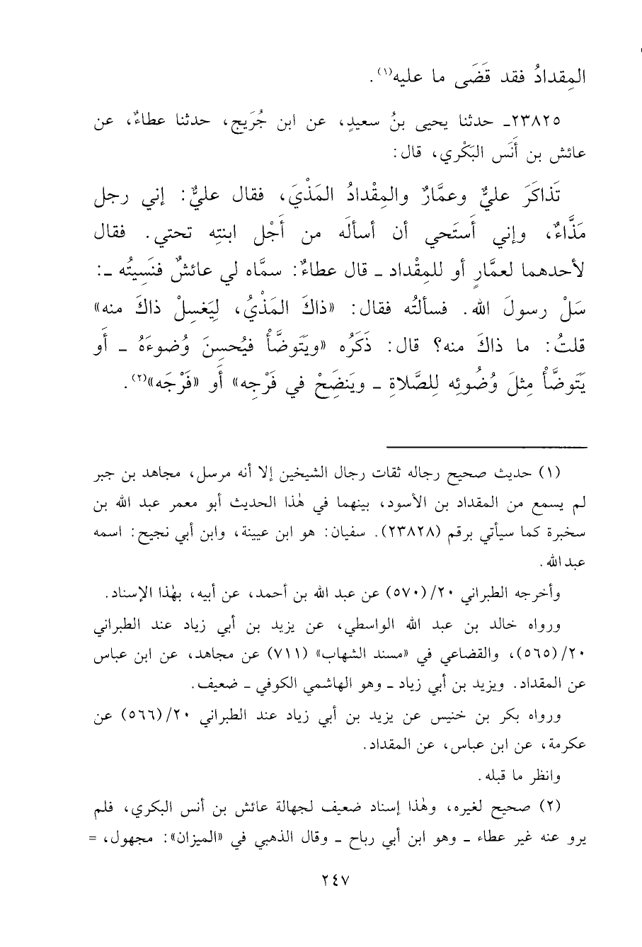 ٢٣٨٢٥ - حَدَّثَنَا يَحْيَى بْنُ سَعِيدٍ، عَنِ ابْنِ جُرَيْحٍ، حَدَّثَنَا عَطَاءٌ، عَنْ عَائِشِ بْنِ أَنَسٍ الْبَكْرِيِّ، قَالَ: تَذَاكَرَ عَلِيٌّ وَعَمَّارٌ وَالْمِقْدَادُ الْمَذْيَ، فَقَالَ عَلِيٌّ: إِنِّي رَجُلٌ مَذَّاءٌ وَإِنِّي أَسْتَحِي أَنْ أَسْأَلَهُ مِنْ أَجْلِ ابْنَتِهِ تَحْتِي، فَقَالَ لِأَحَدِهِمَا لِعَمَّارٍ أَوْ لِلْمِقْدَادِ، قَالَ عَطَاءٌ سَمَّاهُ لِي عَائِشٌ فَنَسِيتُهُ، سَلْ رَسُولَ اللهِ فَسَأَلْتُهُ فَقَالَ: " ذَاكَ الْمَذْيُ، لِيَغْسِلْ ذَاكَ مِنْهُ " قُلْتُ: مَا ذَاكَ مِنْهُ؟ قَالَ: " ذَكَرَهُ وَيَتَوَضَّأْ، فَيُحْسِنْ وُضُوءَهُ، أَوْ يَتَوَضَّأْ مِثْلَ وُضُوئِهِ لِلصَّلَاةِ، وَيَنْضَحْ فِي فَرْجِهِ "، أَوْ " فَرْجَهُ " (٢)