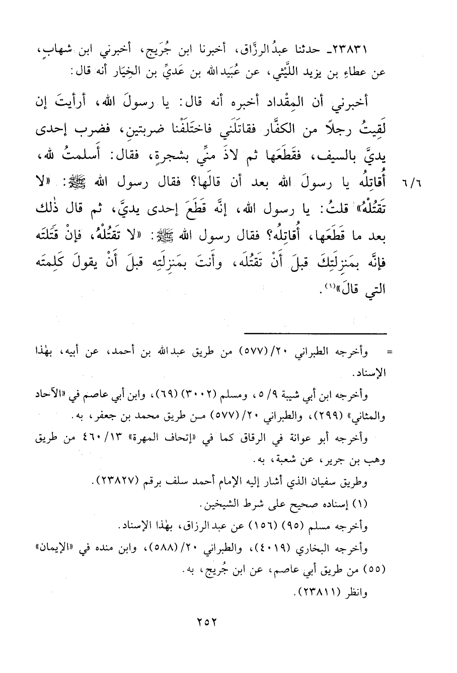 ٢٣٨٣١ - حَدَّثَنَا عَبْدُ الرَّزَّاقِ، أَخْبَرَنَا ابْنُ جُرَيْجٍ، أَخْبَرَنِي ابْنُ شِهَابٍ، عَنْ عَطَاءِ بْنِ يَزِيدَ اللَّيْثِيِّ، عَنْ عُبَيْدِ اللهِ بْنِ عَدِيِّ بْنِ الْخِيَارِ، أَنَّهُ قَالَ: أَخْبَرَنِي أَنَّ الْمِقْدَادَ أَخْبَرَهُ أَنَّهُ قَالَ: يَا رَسُولَ اللهِ، أَرَأَيْتَ إِنْ لَقِيتُ رَجُلًا مِنَ الْكُفَّارِ فَقَاتَلَنِي فَاخْتَلَفْنَا ضَرْبَتَيْنِ، فَضَرَبَ إِحْدَى يَدَيَّ بِالسَّيْفِ فَقَطَعَهَا، ثُمَّ لَاذَ مِنِّي بِشَجَرَةٍ، فَقَالَ: أَسْلَمْتُ لِلَّهِ، أُقَاتِلُهُ يَا رَسُولَ اللهِ بَعْدَ أَنْ قَالَهَا؟ فَقَالَ رَسُولُ اللهِ صَلَّى اللهُ عَلَيْهِ وَسَلَّمَ: " لَا تَقْتُلْهُ "، قُلْتُ: يَا رَسُولَ اللهِ، إِنَّهُ قَطَعَ إِحْدَى يَدَيَّ، ثُمَّ قَالَ: ذَلِكَ بَعْدَ مَا قَطَعَهَا، أُقَاتِلُهُ؟ فَقَالَ رَسُولُ اللهِ: " لَا تَقْتُلْهُ، فَإِنْ قَتَلْتَهُ فَإِنَّهُ بِمَنْزِلَتِكَ قَبْلَ أَنْ تَقْتُلَهُ، وَأَنْتَ بِمَنْزِلَتِهِ قَبْلَ أَنْ يَقُولَ كَلِمَتَهُ الَّتِي قَالَ " (١)