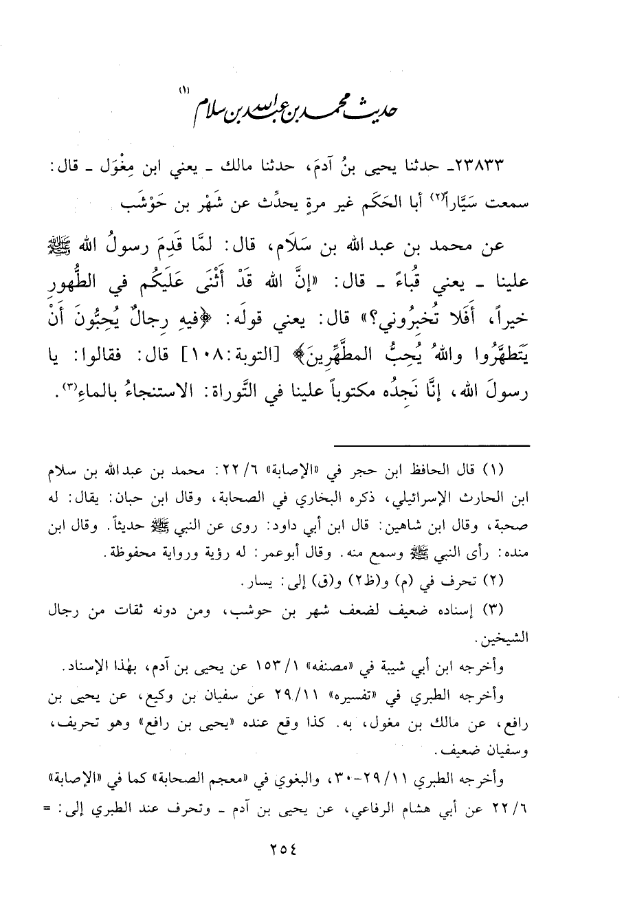 ٢٣٨٣٣ - حَدَّثَنَا يَحْيَى بْنُ آدَمَ، حَدَّثَنَا مَالِكٌ يَعْنِي ابْنَ مِغْوَلٍ، قَالَ: سَمِعْتُ سَيَّارًا (٢) أَبَا الْحَكَمِ، غَيْرَ مَرَّةٍ يُحَدِّثُ عَنْ شَهْرِ بْنِ حَوْشَبٍ، عَنْ مُحَمَّدِ بْنِ عَبْدِ اللهِ بْنِ سَلَامٍ، قَالَ: لَمَّا قَدِمَ رَسُولُ اللهِ صَلَّى اللهُ عَلَيْهِ وَسَلَّمَ عَلَيْنَا، يَعْنِي قُبَاءً، قَالَ: " إِنَّ اللهَ عَزَّ وَجَلَّ قَدْ أَثْنَى عَلَيْكُمْ فِي الطُّهُورِ خَيْرًا، أَفَلَا تُخْبِرُونِي؟ " قَالَ: يَعْنِي قَوْلَهُ: {فِيهِ رِجَالٌ يُحِبُّونَ أَنْ يَتَطَهَّرُوا وَاللهُ يُحِبُّ الْمُطَّهِّرِينَ} [التوبة: ١٠٨] قَالَ: فَقَالُوا: يَا رَسُولَ اللهِ إِنَّا نَجِدُهُ مَكْتُوبًا عَلَيْنَا فِي التَّوْرَاةِ: الِاسْتِنْجَاءُ بِالْمَاءِ (٣)