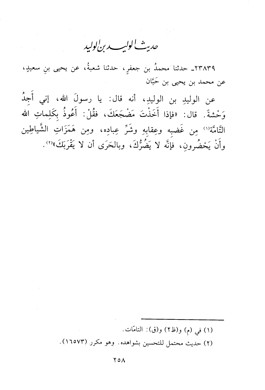 ٢٣٨٣٩ - حَدَّثَنَا مُحَمَّدُ بْنُ جَعْفَرٍ، حَدَّثَنَا شُعْبَةُ، عَنْ يَحْيَى بْنِ سَعِيدٍ، عَنْ مُحَمَّدِ بْنِ يَحْيَى بْنِ حَبَّانَ، عَنِ الْوَلِيدِ بْنِ الْوَلِيدِ، أَنَّهُ قَالَ: يَا رَسُولَ اللهِ، إِنِّي أَجِدُ وَحْشَةً، قَالَ: " فَإِذَا أَخَذْتَ مَضْجَعَكَ، فَقُلْ: أَعُوذُ بِكَلِمَاتِ اللهِ التَّامَّةُ (١) مِنْ غَضَبِهِ وَعِقَابِهِ وَشَرِّ عِبَادِهِ، وَمِنْ هَمَزَاتِ الشَّيَاطِينِ وَأَنْ يَحْضُرُونِ، فَإِنَّهُ لَا يَضُرُّكَ، وَبِالْحَرِيِّ أَنْ لَا يَقْرَبَكَ " (٢)