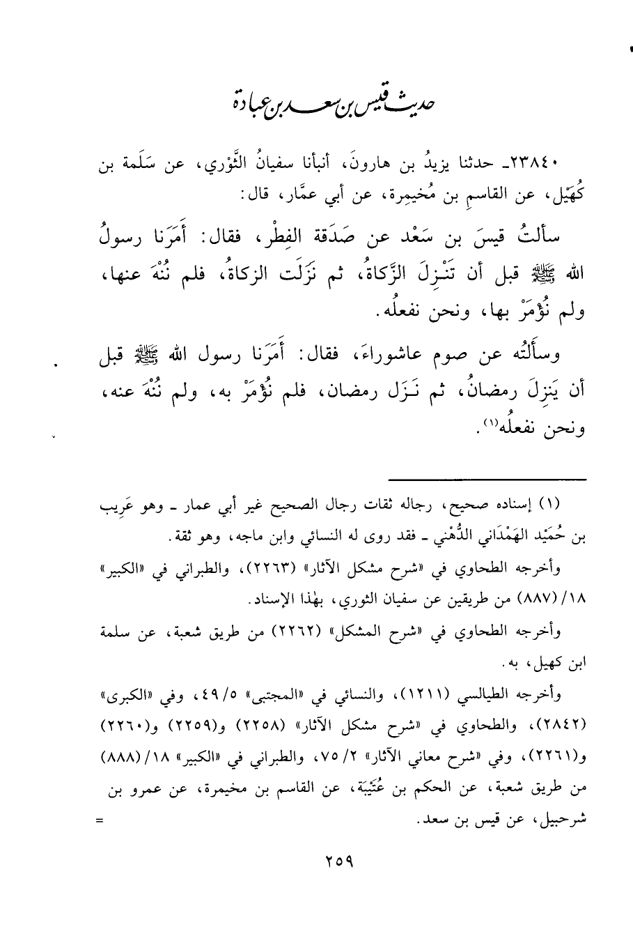 ٢٣٨٤٠ - حَدَّثَنَا يَزِيدُ بْنُ هَارُونَ، أَنْبَأَنَا سُفْيَانُ الثَّوْرِيُّ، عَنْ سَلَمَةَ بْنِ كُهَيْلٍ، عَنِ الْقَاسِمِ بْنِ مُخَيْمِرَةَ، عَنْ أَبِي عَمَّارٍ، قَالَ: سَأَلْتُ قَيْسَ بْنَ سَعْدٍ عَنْ صَدَقَةِ الْفِطْرِ، فَقَالَ: " أَمَرَنَا رَسُولُ اللهِ صَلَّى اللهُ عَلَيْهِ وَسَلَّمَ قَبْلَ أَنْ تَنْزِلَ الزَّكَاةُ، ثُمَّ نَزَلَتِ الزَّكَاةُ، فَلَمْ نُنْهَ عَنْهَا، وَلَمْ نُؤْمَرْ بِهَا، وَنَحْنُ نَفْعَلُهُ "