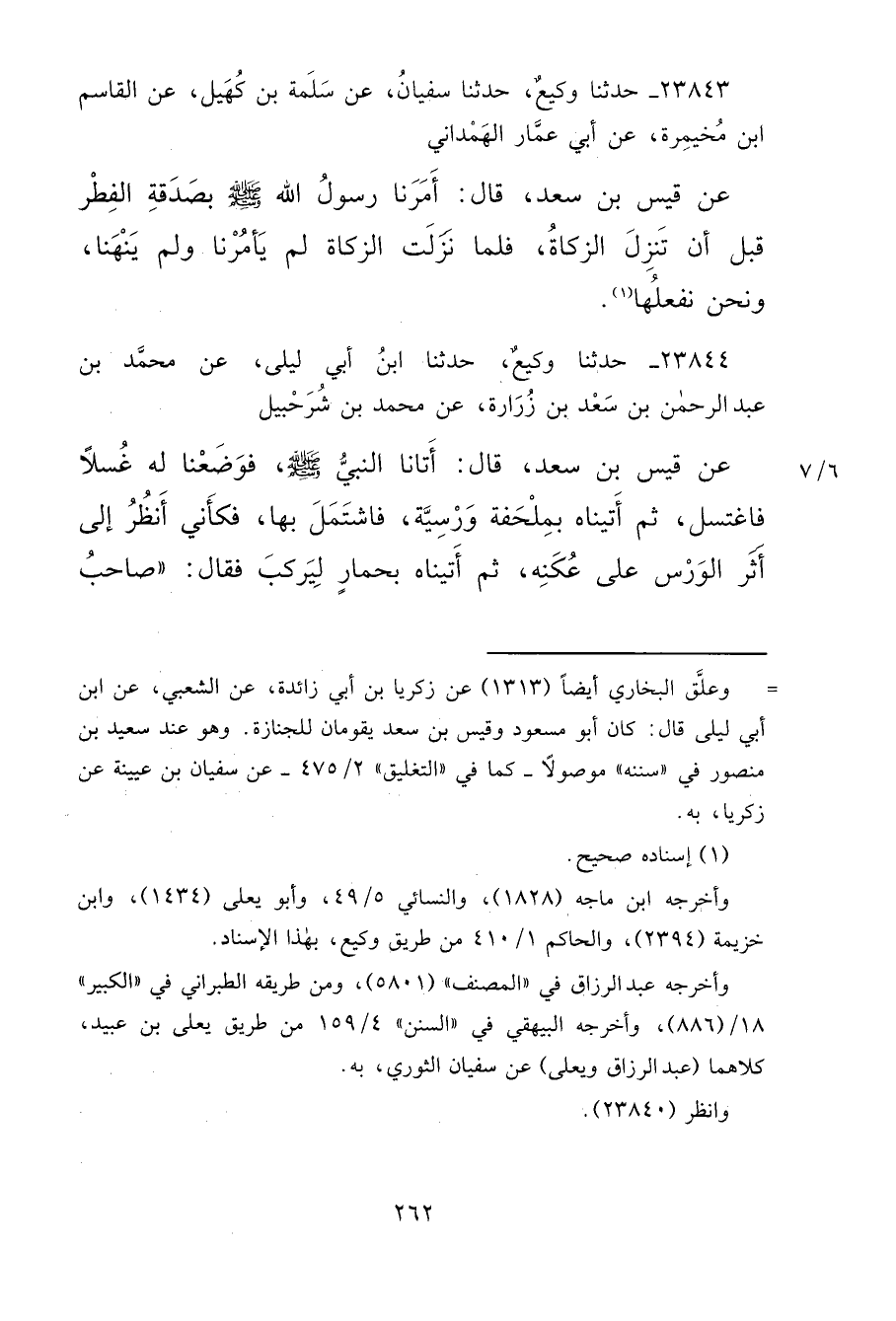 ٢٣٨٤٣ - حَدَّثَنَا وَكِيعٌ، حَدَّثَنَا سُفْيَانُ، عَنْ سَلَمَةَ بْنِ كُهَيْلٍ، عَنِ الْقَاسِمِ بْنِ مُخَيْمِرَةَ، عَنْ أَبِي عَمَّارٍ الْهَمْدَانِيِّ، عَنْ قَيْسِ بْنِ سَعْدٍ، قَالَ: " أَمَرَنَا رَسُولُ اللهِ صَلَّى اللهُ عَلَيْهِ وَسَلَّمَ بِصَدَقَةِ الْفِطْرِ قَبْلَ أَنْ تَنْزِلَ الزَّكَاةُ، فَلَمَّا نَزَلَتِ الزَّكَاةُ لَمْ يَأْمُرْنَا، وَلَمْ يَنْهَنَا وَنَحْنُ نَفْعَلُهَا " (١)