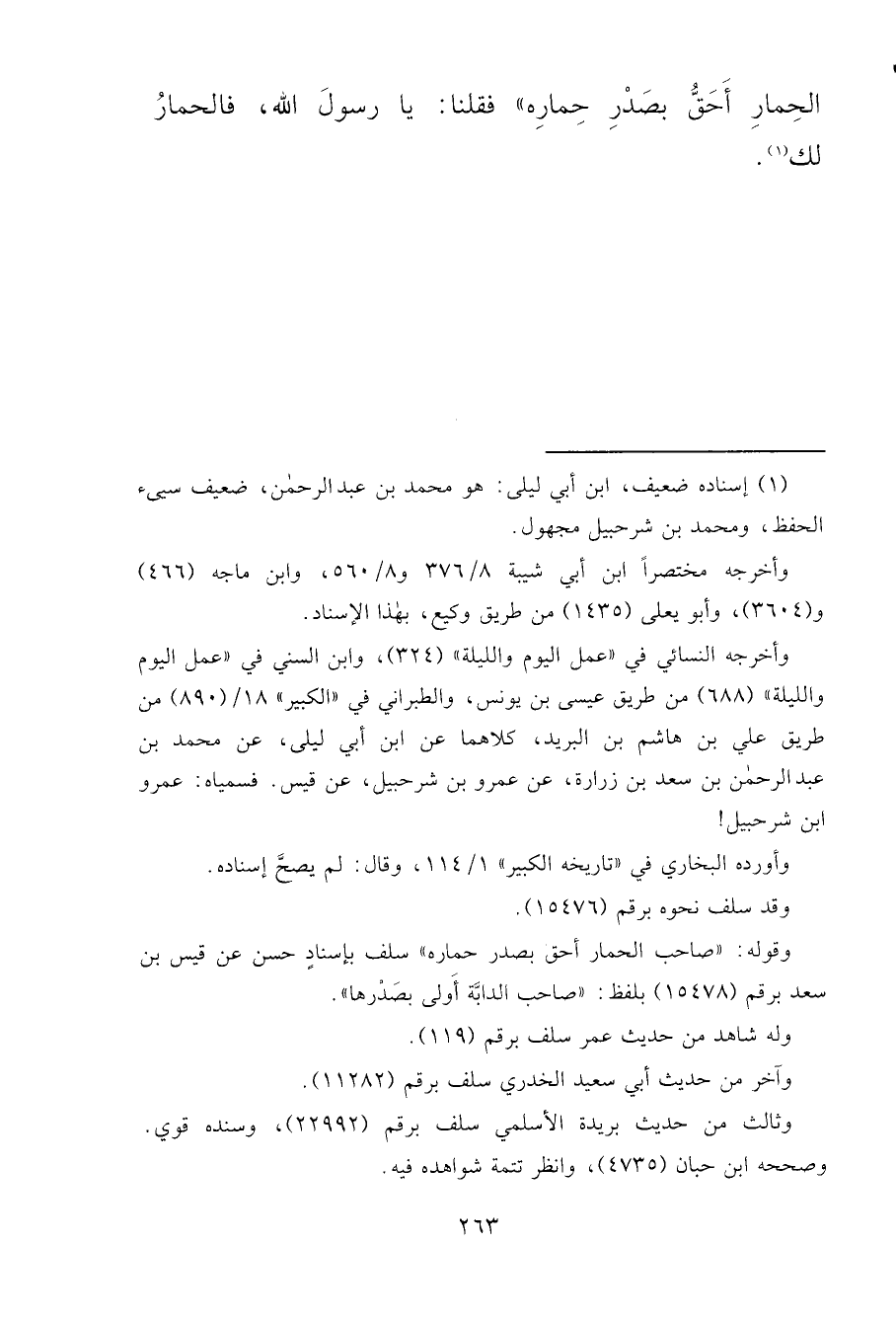 الْحِمَارِ أَحَقُّ بِصَدْرِ حِمَارِهِ " فَقُلْنَا: يَا رَسُولَ اللهِ، فَالْحِمَارُ لَكَ (١)