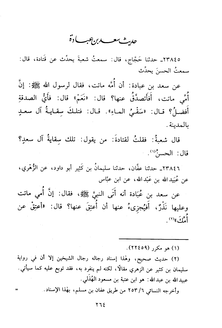 ٢٣٨٤٥ - حَدَّثَنَا حَجَّاجٌ، قَالَ: سَمِعْتُ شُعْبَةَ، يُحَدِّثُ عَنْ قَتَادَةَ، قَالَ: سَمِعْتُ الْحَسَنَ، يُحَدِّثُ عَنْ سَعْدِ بْنِ عُبَادَةَ: أَنَّ أُمَّهُ مَاتَتْ، فَقَالَ لِرَسُولِ اللهِ صَلَّى اللهُ عَلَيْهِ وَسَلَّمَ: إِنَّ أُمِّي مَاتَتْ أَفَأَتَصَدَّقُ عَنْهَا؟ قَالَ: " نَعَمْ " قَالَ: فَأَيُّ الصَّدَقَةِ أَفْضَلُ؟ قَالَ: " سَقْيُ الْمَاءِ " " قَالَ: فَتِلْكَ سِقَايَةُ آلِ سَعْدٍ بِالْمَدِينَةِ " قَالَ شُعْبَةُ: فَقُلْتُ لِقَتَادَةَ: مَنْ يَقُولُ تِلْكَ سِقَايَةُ آلِ سَعْدٍ قَالَ: الْحَسَنُ (١)