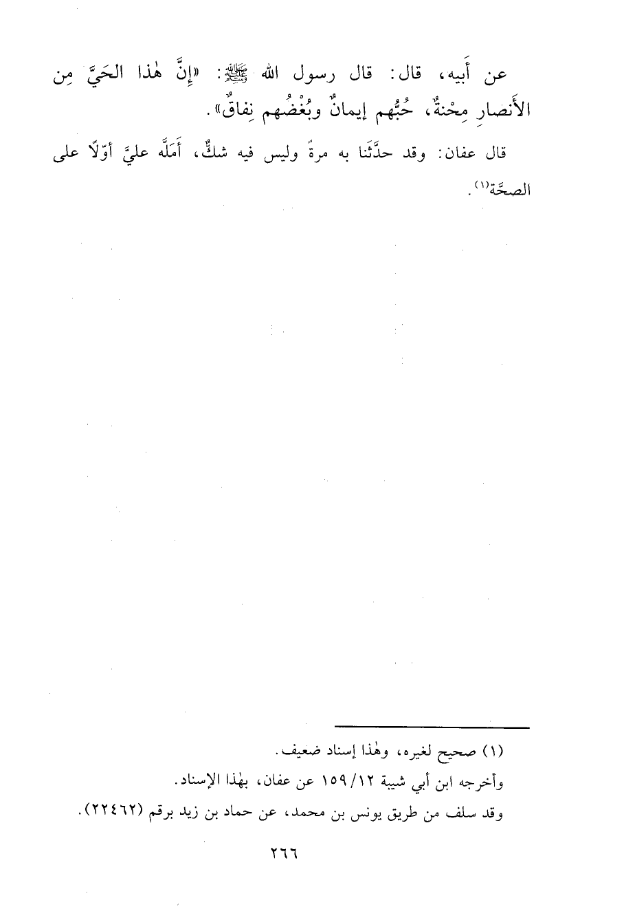 عَنْ أَبِيهِ، قَالَ: قَالَ رَسُولُ اللهِ صَلَّى اللهُ عَلَيْهِ وَسَلَّمَ: " إِنَّ هَذَا الْحَيَّ مِنَ الْأَنْصَارِ مِحْنَةٌ، حُبُّهُمْ إِيمَانٌ وَبُغْضُهُمْ نِفَاقٌ "، قَالَ عَفَّانُ: وَقَدْ حَدَّثَنَا بِهِ مَرَّةً وَلَيْسَ فِيهِ شَكٌّ، أَمَلَّهُ عَلَيَّ أَوَّلًا عَلَى الصِّحَّةِ (١)