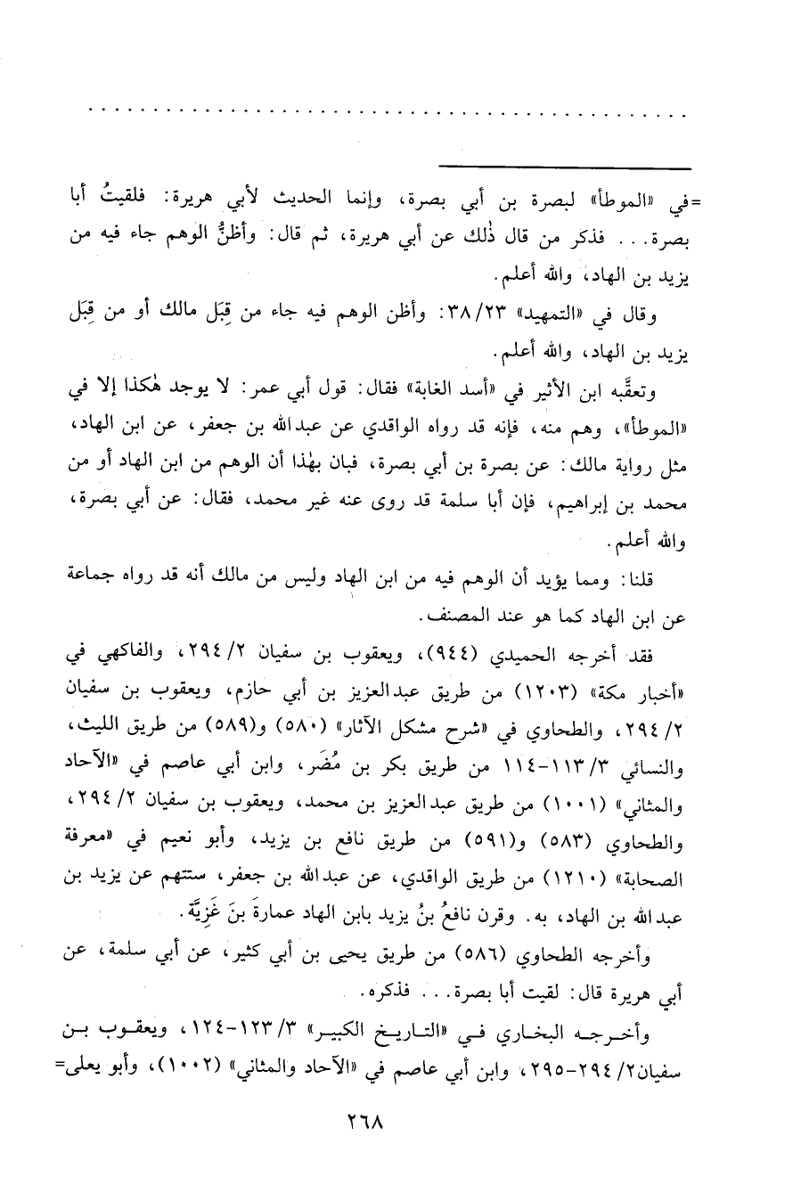وتعقَّبه ابن الأثير في "أسد الغابة" فقال: قول أبي عمر: لا يوجد هكذا إلا في "الموطأ"، وهم منه، فإنه قد رواه الواقدي عن عبد الله بن جعفر، عن ابن الهاد، مثل رواية مالك: عن بصرة بن أبي بصرة، فبان بهذا أن الوهم من ابن الهاد أو من محمد بن إبراهيم، فإن أبا سلمة قد روى عنه غير محمد، فقال: عن أبي بصرة، والله أعلم.
