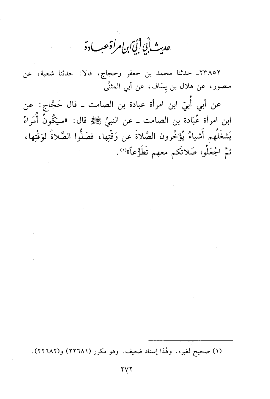 ٢٣٨٥٢ - حَدَّثَنَا مُحَمَّدُ بْنُ جَعْفَرٍ، وَحَجَّاجٌ، قَالَا: حَدَّثَنَا شُعْبَةُ، عَنْ مَنْصُورٍ، عَنْ هِلَالِ بْنِ يِسَافٍ، عَنْ أَبِي الْمُثَنَّى، عَنْ أَبِي أُبَيِّ ابْنِ امْرَأَةِ عُبَادَةَ بْنِ الصَّامِتِ، قَالَ حَجَّاجٌ، عَنِ ابْنِ امْرَأَةِ عُبَادَةَ بْنِ الصَّامِتِ، عَنِ النَّبِيِّ صَلَّى اللهُ عَلَيْهِ وَسَلَّمَ قَالَ: " سَيَكُونُ أُمَرَاءُ يَشْغَلُهُمْ أَشْيَاءُ وَيُؤَخِّرُونَ الصَّلَاةَ عَنْ وَقْتِهَا، فَصَلُّوا الصَّلَاةَ لِوَقْتِهَا، ثُمَّ اجْعَلُوا صَلَاتَكُمْ مَعَهُمْ تَطَوُّعًا " (١)