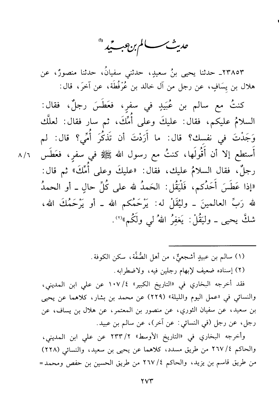 ٢٣٨٥٣ - حَدَّثَنَا يَحْيَى بنُ سَعِيدٍ، حَدَّثَنِي سُفْيَانُ، حَدَّثَنَا مَنْصُورٌ، عَنْ هِلَالِ بْنِ يِسَافٍ، عَنْ رَجُلٍ، مِنْ آلِ خَالِدِ بْنِ عُرْفُطَةَ، عَنْ آخَرَ قَالَ: كُنْتُ مَعَ سَالِمِ بْنِ عُبَيْدٍ فِي سَفَرٍ، فَعَطَسَ رَجُلٌ، فَقَالَ: السَّلَامُ عَلَيْكُمْ، فَقَالَ: عَلَيْكَ وَعَلَى أُمِّكَ، ثُمَّ سَارَ فَقَالَ: لَعَلَّكَ وَجَدْتَ فِي نَفْسِكَ؟ قَالَ: مَا أَرَدْتُ أَنْ تَذْكُرَ أُمِّي؟ قَالَ: لَمْ أَسْتَطِعْ إِلَّا أَنْ أَقُولَهَا، كُنْتُ مَعَ رَسُولِ اللهِ صَلَّى اللهُ عَلَيْهِ وَسَلَّمَ فِي سَفَرٍ، فَعَطَسَ رَجُلٌ، فَقَالَ: السَّلَامُ عَلَيْكَ، فَقَالَ: " عَلَيْكَ وَعَلَى أُمِّكَ "، ثُمَّ قَالَ: " إِذَا عَطَسَ أَحَدُكُمْ، فَلْيَقُلِ الْحَمْدُ لِلَّهِ عَلَى كُلِّ حَالٍ، أَوِ الْحَمْدُ لِلَّهِ رَبِّ الْعَالَمِينَ، وَلْيُقَلْ لَهُ: يَرْحَمُكُمُ اللهُ، أَوْ يَرْحَمُكَ اللهُ، شَكَّ يَحْيَى، وَلْيَقُلْ: يَغْفِرُ اللهُ لِي وَلَكُمْ " (٢)