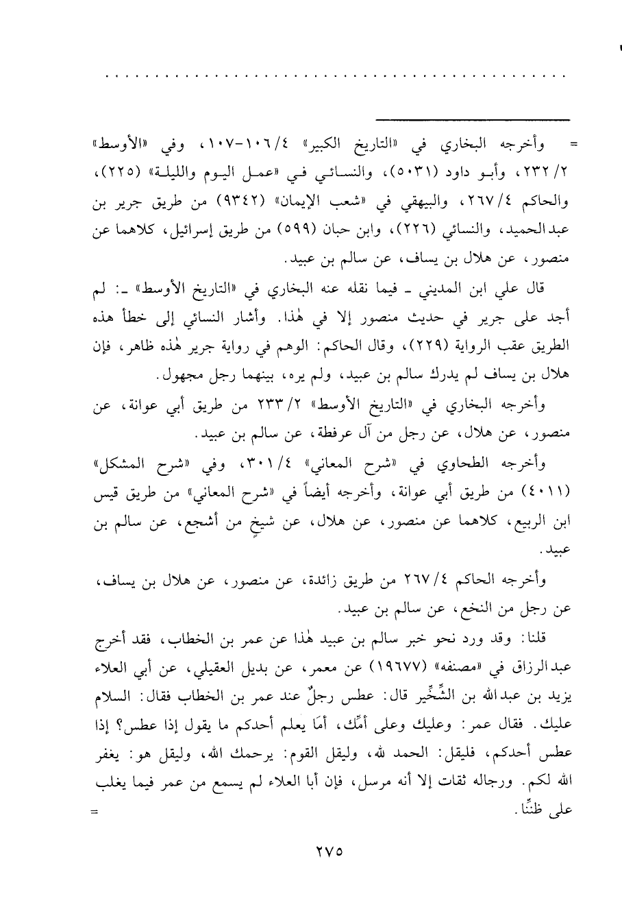 قال علي ابن المديني -فيما نقله عنه البخاري في "التاريخ الأوسط"-: لم أجد على جرير في حديث منصور إلا في هذا. وأشار النسائي إلى خطأ هذه الطريق عقب الرواية (٢٢٩) ، وقال الحاكم: الوهم في رواية جرير هذه ظاهر، فإن هلال بن يساف لم يدرك سالم بن عبيد، ولم يره، بينهما رجل مجهول.
