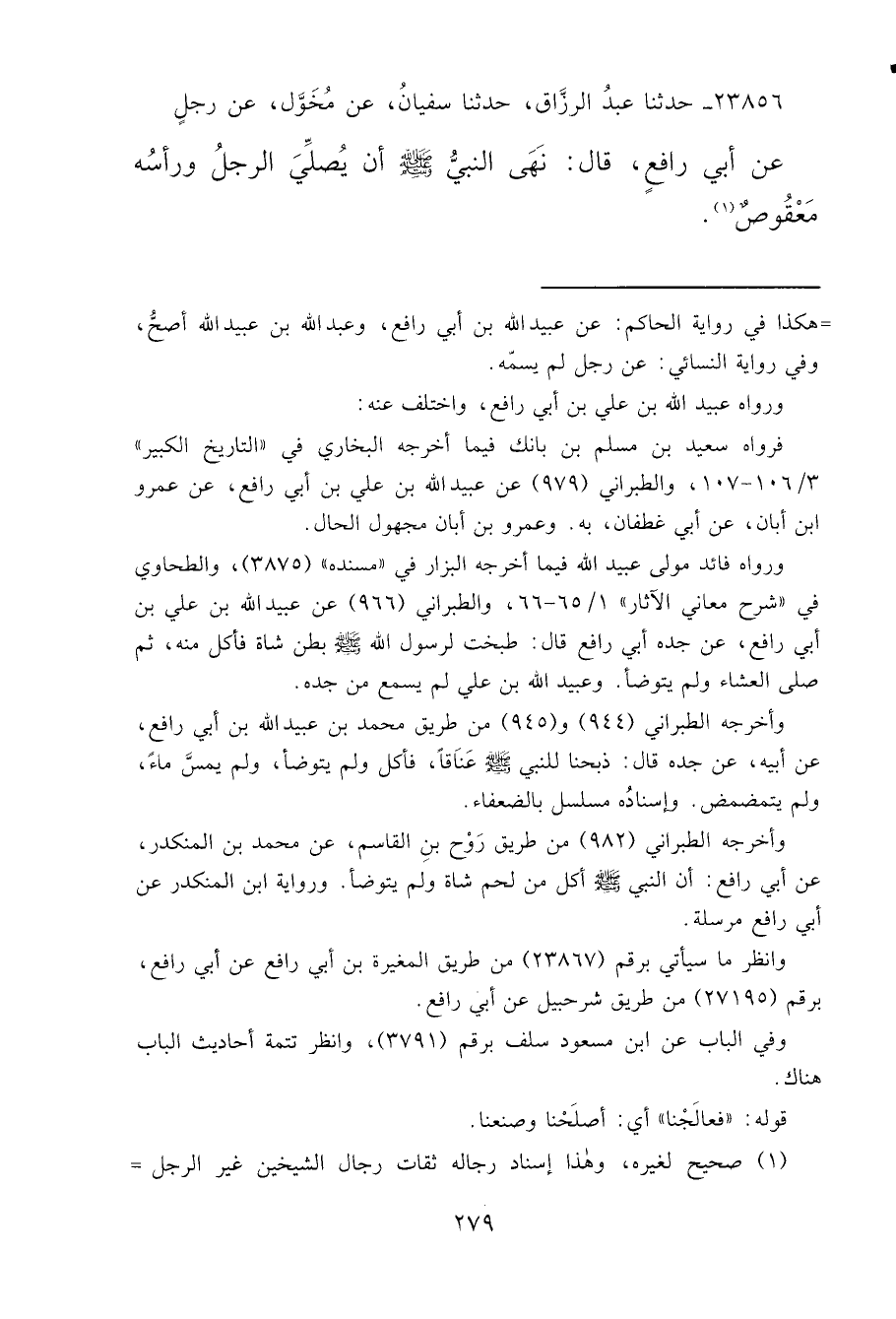 ٢٣٨٥٦ - حَدَّثَنَا عَبْدُ الرَّزَّاقِ، حَدَّثَنَا سُفْيَانُ، عَنْ مُخَوَّلٍ، عَنْ رَجُلٍ، عَنْ أَبِي رَافِعٍ، قَالَ: " نَهَى النَّبِيُّ صَلَّى اللهُ عَلَيْهِ وَسَلَّمَ أَنْ يُصَلِّيَ الرَّجُلُ وَرَأْسُهُ مَعْقُوصٌ " (١)