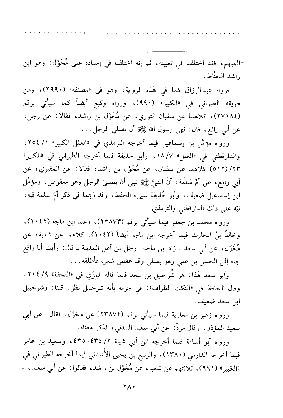 فرواه عبد الرزاق كما في هذه الرواية، وهو في "مصنفه" (٢٩٩٠) ، ومن طريقه الطبراني في "الكبير" (٩٩٠) ، ورواه وكيع أيضاً كما سيأتي برقم (٢٧١٨٤) ، كلاهما عن سفيان الثوري، عن مُخَوَّل بن راشد، فقالا: عن رجل، عن أبي رافع، قال: نهى رسول الله صَلَّى اللهُ عَلَيْهِ وَسَلَّمَ أن يصلي الرجل ...