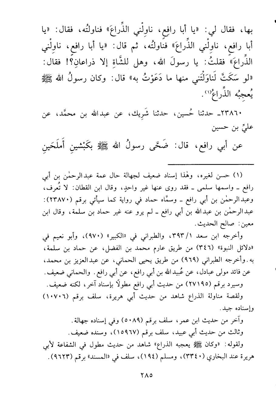 بِهَا فَقَالَ لِي: " يَا أَبَا رَافِعٍ نَاوِلْنِي الذِّرَاعَ فَنَاوَلْتُهُ " فَقَالَ: " يَا أَبَا رَافِعٍ نَاوِلْنِي الذِّرَاعَ فَنَاوَلْتُهُ " ثُمَّ قَالَ: " يَا أَبَا رَافِعٍ نَاوِلْنِي الذِّرَاعَ " فَقُلْتُ: يَا رَسُولَ اللهِ وَهَلْ لِلشَّاةِ إِلَّا ذِرَاعَانِ؟ فَقَالَ: " لَوْ سَكَتَّ لَنَاوَلْتَنِي مِنْهَا مَا دَعَوْتُ بِهِ " قَالَ: وَكَانَ رَسُولُ اللهِ صَلَّى اللهُ عَلَيْهِ وَسَلَّمَ يُعْجِبُهُ الذِّرَاعُ (١)