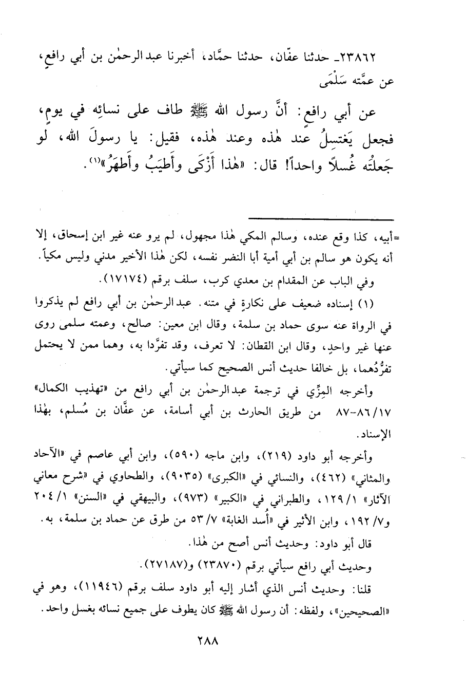٢٣٨٦٢ - حَدَّثَنَا عَفَّانُ، حَدَّثَنَا حَمَّادٌ، أَخْبَرَنَا عَبْدُ الرَّحْمَنِ بْنُ أَبِي رَافِعٍ، عَنْ عَمَّتِهِ سَلْمَى، عَنْ أَبِي رَافِعٍ: أَنَّ رَسُولَ اللهِ صَلَّى اللهُ عَلَيْهِ وَسَلَّمَ طَافَ عَلَى نِسَائِهِ فِي يَوْمٍ، فَجَعَلَ يَغْتَسِلُ عِنْدَ هَذِهِ وَعِنْدَ هَذِهِ، فَقِيلَ: يَا رَسُولَ اللهِ، لَوْ جَعَلْتَهُ غُسْلًا وَاحِدًا قَالَ: " هَذَا أَزْكَى وَأَطْيَبُ وَأَطْهَرُ " (١)