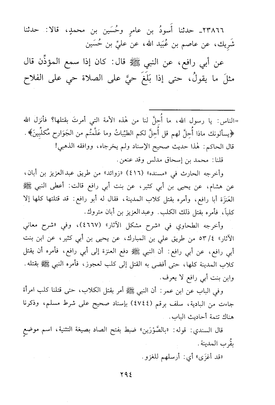 ٢٣٨٦٦ - حَدَّثَنَا أَسْوَدُ بْنُ عَامِرٍ، وَحُسَيْنُ بْنُ مُحَمَّدٍ، قَالَا: حَدَّثَنَا شَرِيكٌ، عَنْ عَاصِمِ بْنِ عُبَيْدِ اللهِ، عَنْ عَلِيِّ بْنِ الْحُسَيْنِ، عَنْ أَبِي رَافِعٍ، عَنِ النَّبِيِّ صَلَّى اللهُ عَلَيْهِ وَسَلَّمَ قَالَ: كَانَ إِذَا سَمِعَ الْمُؤَذِّنَ قَالَ مِثْلَ مَا يَقُولُ، حَتَّى إِذَا بَلَغَ حَيَّ عَلَى الصَّلَاةِ حَيَّ عَلَى الْفَلَاحِ