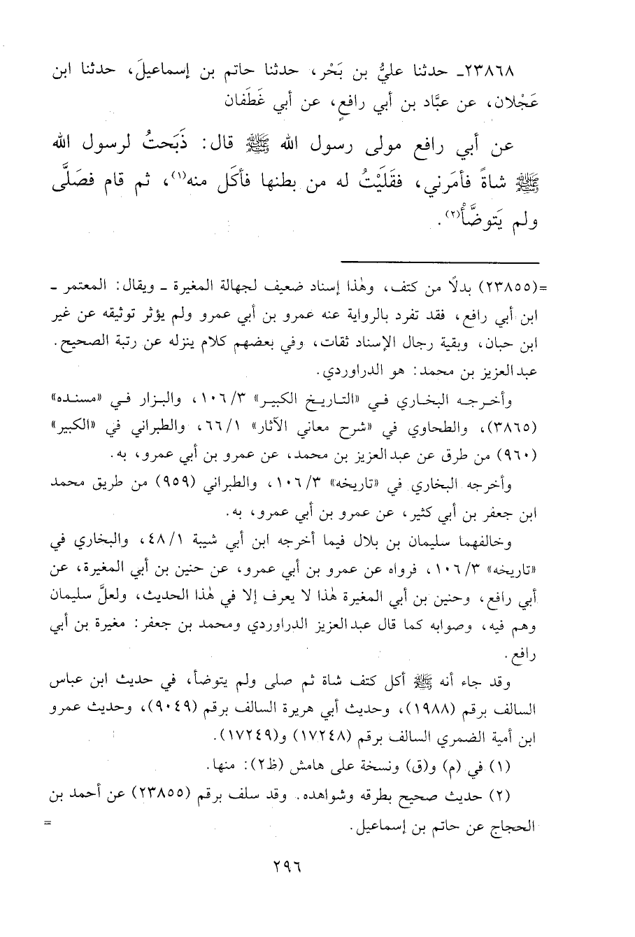 ٢٣٨٦٨ - حَدَّثَنَا عَلِيُّ بْنُ بَحْرٍ، حَدَّثَنَا حَاتِمُ بْنُ إِسْمَاعِيلَ، حَدَّثَنَا ابْنُ عَجْلَانَ، عَنْ عَبَّادِ بْنِ أَبِي رَافِعٍ، عَنْ أَبِي غَطَفَانَ، عَنْ أَبِي رَافِعٍ، مَوْلَى رَسُولِ اللهِ صَلَّى اللهُ عَلَيْهِ وَسَلَّمَ قَالَ: ذَبَحْتُ لِرَسُولِ اللهِ صَلَّى اللهُ عَلَيْهِ وَسَلَّمَ شَاةً " فَأَمَرَنِي فَقَلَيْتُ لَهُ مِنْ بَطْنِهَا، فَأَكَلَ مِنْهُ (١) ، ثُمَّ قَامَ فَصَلَّى، وَلَمْ يَتَوَضَّأْ " (٢)