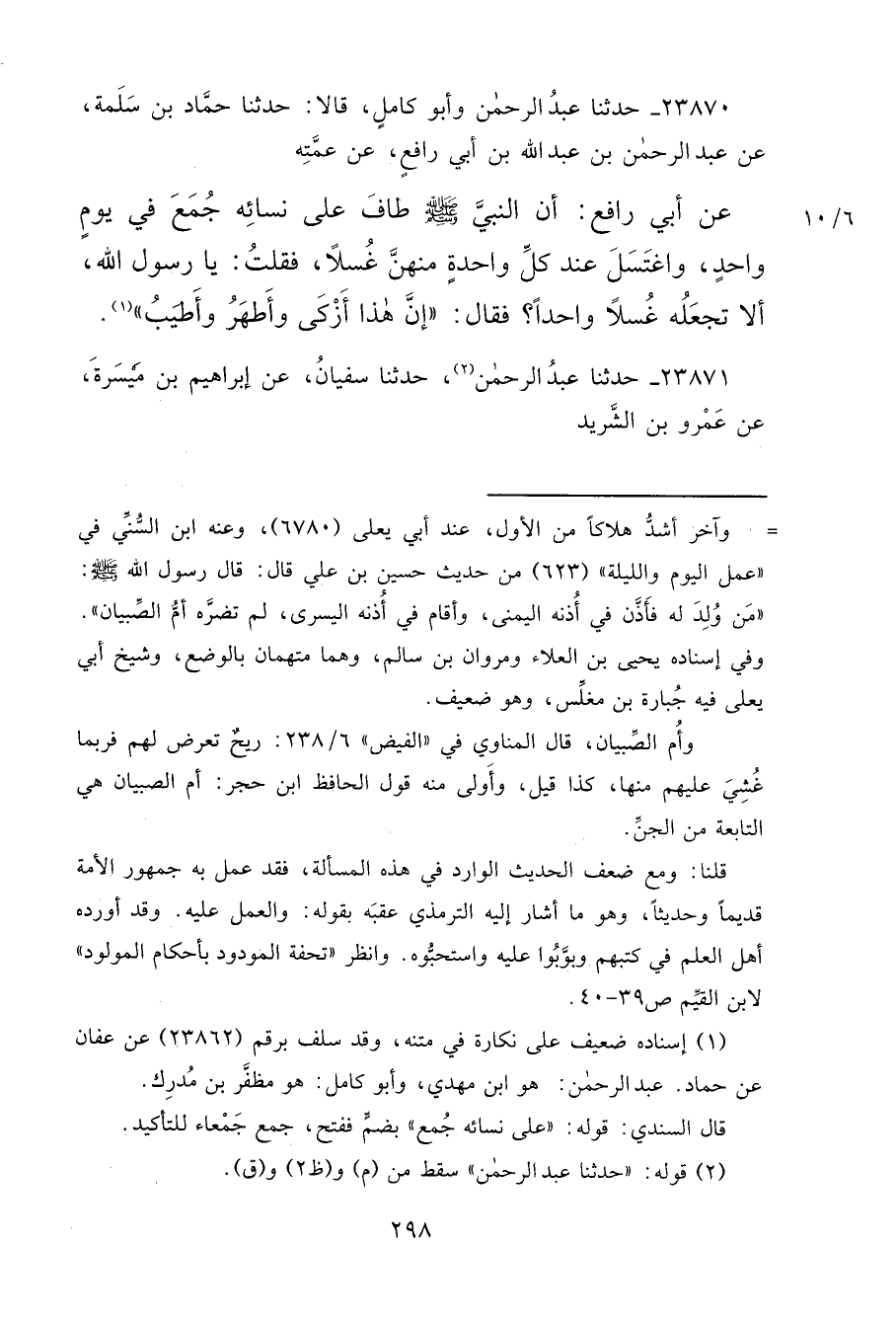 ٢٣٨٧٠ - حَدَّثَنَا عَبْدُ الرَّحْمَنِ، وَأَبُو كَامِلٍ، قَالَا: حَدَّثَنَا حَمَّادُ بْنُ سَلَمَةَ، عَنْ عَبْدِ الرَّحْمَنِ بْنِ عَبْدِ اللهِ بْنِ أَبِي رَافِعٍ، عَنْ عَمَّتِهِ، عَنْ أَبِي رَافِعٍ: أَنَّ النَّبِيَّ صَلَّى اللهُ عَلَيْهِ وَسَلَّمَ طَافَ عَلَى نِسَائِهِ جَمَعَ فِي يَوْمٍ وَاحِدٍ، وَاغْتَسَلَ عِنْدَ كُلِّ وَاحِدَةٍ مِنْهُنَّ غُسْلًا، فَقُلْتُ: يَا رَسُولَ اللهِ، أَلَا تَجْعَلُهُ غُسْلًا وَاحِدًا؟ فَقَالَ: " إِنَّ هَذَا أَزْكَى وَأَطْهَرُ وَأَطْيَبُ " (١)