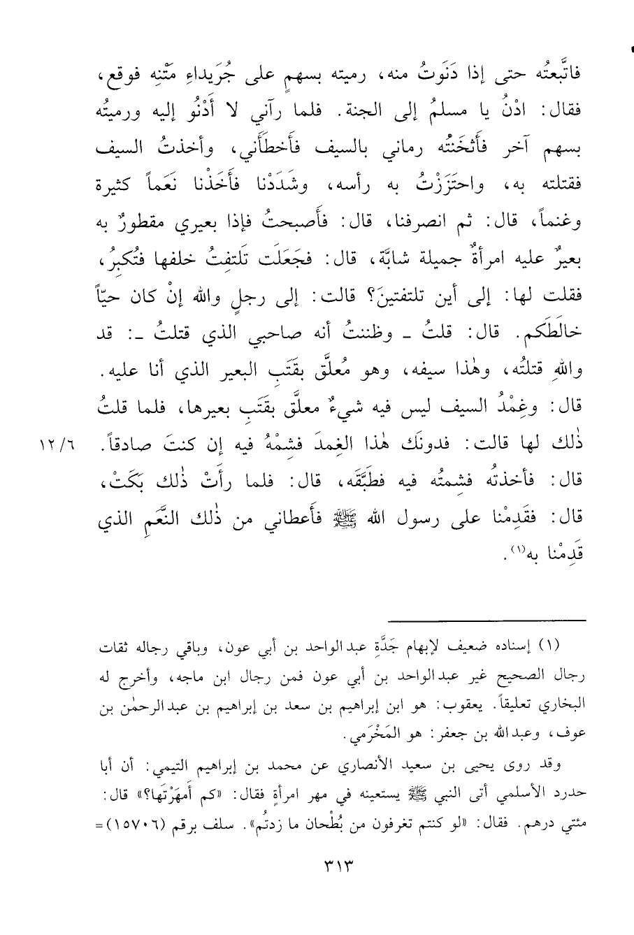 فَاتَّبَعْتُهُ حَتَّى إِذَا دَنَوْتُ مِنْهُ، رَمَيْتُهُ بِسَهْمٍ عَلَى جُرَيْدَاءِ مَتْنِهِ فَوَقَعَ، فَقَالَ: ادْنُ يَا مُسْلِمُ إِلَى الْجَنَّةِ، فَلَمَّا رَآنِي لَا أَدْنُو إِلَيْهِ وَرَمَيْتُهُ بِسَهْمٍ آخَرَ، فَأَثْخَنْتُهُ رَمَانِي بِالسَّيْفِ فَأَخْطَأَنِي، وَأَخَذْتُ السَّيْفَ فَقَتَلْتُهُ بِهِ، وَاحْتَزَزْتُ بِهِ رَأْسَهُ، وَشَدَدْنَا فَأَخَذْنَا نَعَمًا كَثِيرَةً وَغَنَمًا، قَالَ: ثُمَّ انْصَرَفْنَا، قَالَ: فَأَصْبَحْتُ فَإِذَا بَعِيرِي مَقْطُورٌ بِهِ بَعِيرٌ عَلَيْهِ امْرَأَةٌ جَمِيلَةٌ شَابَّةٌ، قَالَ: فَجَعَلَتْ تَلْتَفِتُ خَلْفَهَا فَتُكَبِّرُ، فَقُلْتُ لَهَا: إِلَى أَيْنَ تَلْتَفِتِينَ؟ قَالَتْ: إِلَى رَجُلٍ وَاللهِ إِنْ كَانَ حَيًّا خَالَطَكُمْ، قَالَ: قُلْتُ، وَظَنَنْتُ أَنَّهُ صَاحِبِي الَّذِي قَتَلْتُ،: قَدْ وَاللهِ قَتَلْتُهُ، وَهَذَا سَيْفُهُ، وَهُوَ مُعَلَّقٌ بِقَتَبِ الْبَعِيرِ الَّذِي أَنَا عَلَيْهِ، قَالَ: وَغِمْدُ السَّيْفِ لَيْسَ فِيهِ شَيْءٌ مُعَلَّقٌ بِقَتَبِ بَعِيرِهَا، فَلَمَّا قُلْتُ ذَلِكَ لَهَا، قَالَتْ: فَدُونَكَ هَذَا الْغِمْدَ فَشِمْهُ فِيهِ إِنْ كُنْتَ صَادِقًا، قَالَ: فَأَخَذْتُهُ فَشِمْتُهُ فِيهِ فَطَبَقَهُ، قَالَ: فَلَمَّا رَأَتْ ذَلِكَ بَكَتْ، قَالَ: فَقَدِمْنَا عَلَى رَسُولِ اللهِ صَلَّى اللهُ عَلَيْهِ وَسَلَّمَ فَأَعْطَانِي مِنْ ذَلِكَ النَّعَمِ الَّذِي قَدِمْنَا بِهِ (١)