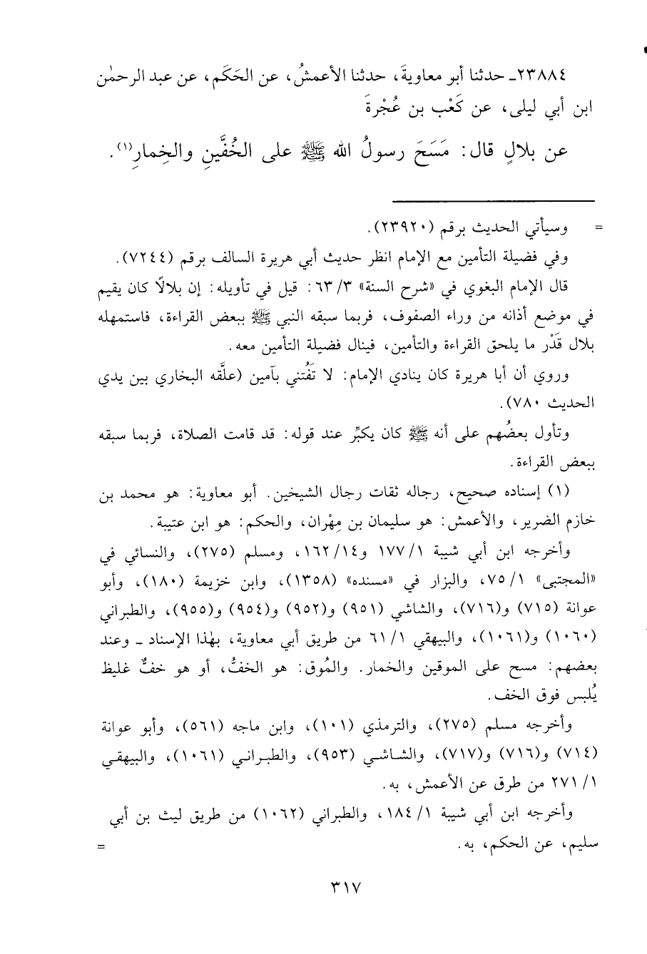 ٢٣٨٨٤ - حَدَّثَنَا أَبُو مُعَاوِيَةَ، حَدَّثَنَا الْأَعْمَشُ، عَنِ الْحَكَمِ، عَنْ عَبْدِ الرَّحْمَنِ بْنِ أَبِي لَيْلَى، عَنْ كَعْبِ بْنِ عُجْرَةَ، عَنْ بِلَالٍ، قَالَ: " مَسَحَ رَسُولُ اللهِ صَلَّى اللهُ عَلَيْهِ وَسَلَّمَ عَلَى الْخُفَّيْنِ وَالْخِمَارِ " (١)
