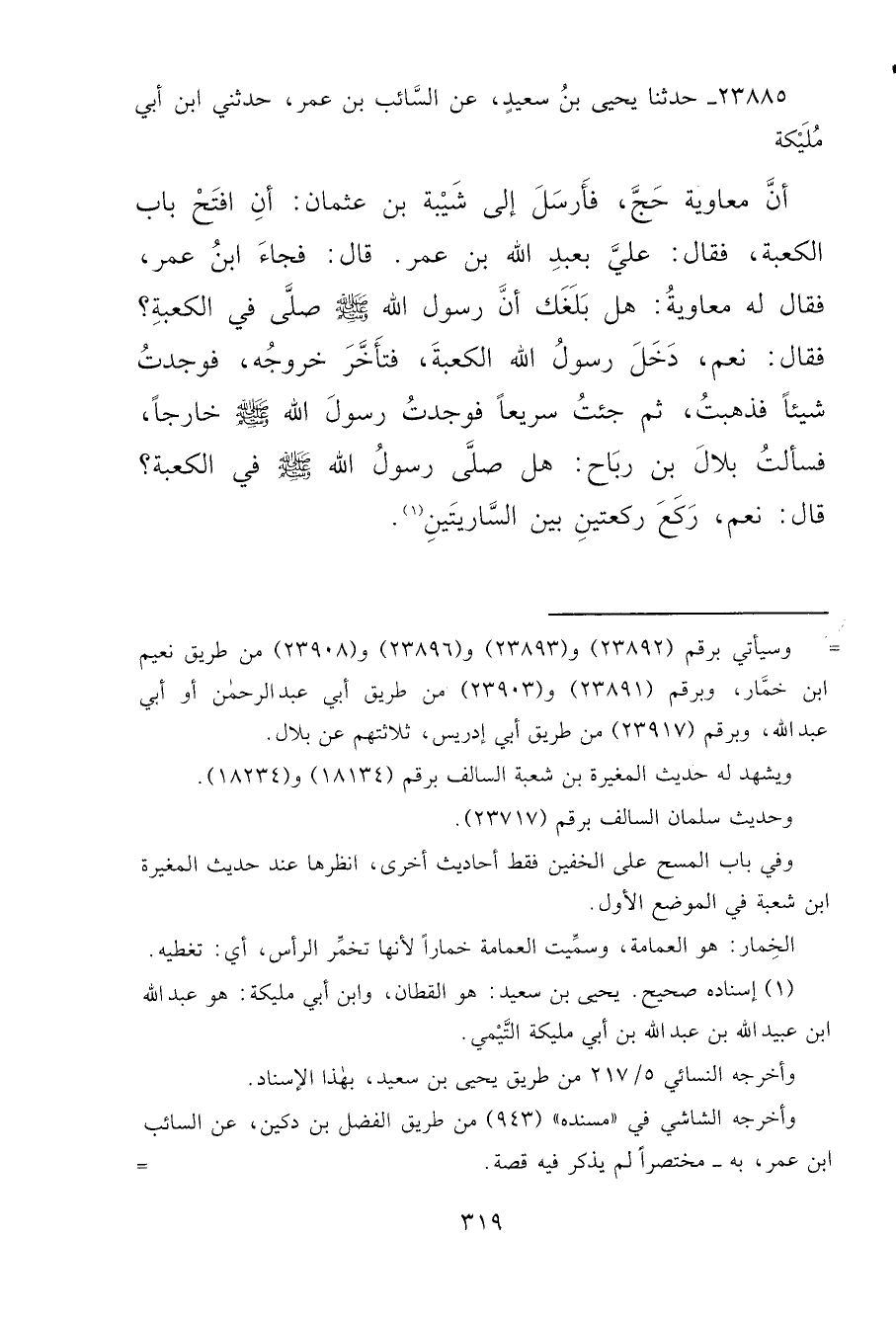 ٢٣٨٨٥ - حَدَّثَنَا يَحْيَى بْنُ سَعِيدٍ، عَنِ السَّائِبِ بْنِ عُمَرَ، حَدَّثَنِي ابْنُ أَبِي مُلَيْكَةَ، أَنَّ مُعَاوِيَةَ، حَجَّ فَأَرْسَلَ إِلَى شَيْبَةَ بْنِ عُثْمَانَ أَنْ افْتَحْ بَابَ الْكَعْبَةِ، فَقَالَ: عَلَيَّ بِعَبْدِ اللهِ بْنِ عُمَرَ قَالَ: فَجَاءَ ابْنُ عُمَرَ فَقَالَ لَهُ مُعَاوِيَةُ: هَلْ بَلَغَكَ أَنَّ رَسُولَ اللهِ صَلَّى اللهُ عَلَيْهِ وَسَلَّمَ صَلَّى فِي الْكَعْبَةِ؟ فَقَالَ: نَعَمْ دَخَلَ رَسُولُ اللهِ الْكَعْبَةَ، فَتَأَخَّرَ خُرُوجُهُ فَوَجَدْتُ شَيْئًا فَذَهَبْتُ، ثُمَّ جِئْتُ سَرِيعًا، فَوَجَدْتُ رَسُولَ اللهِ صَلَّى اللهُ عَلَيْهِ وَسَلَّمَ خَارِجًا، فَسَأَلْتُ بِلَالَ بْنَ رَبَاحٍ هَلْ صَلَّى رَسُولُ اللهِ صَلَّى اللهُ عَلَيْهِ وَسَلَّمَ فِي الْكَعْبَةِ؟ قَالَ: " نَعَمْ رَكَعَ رَكْعَتَيْنِ بَيْنَ السَّارِيَتَيْنِ " (١)