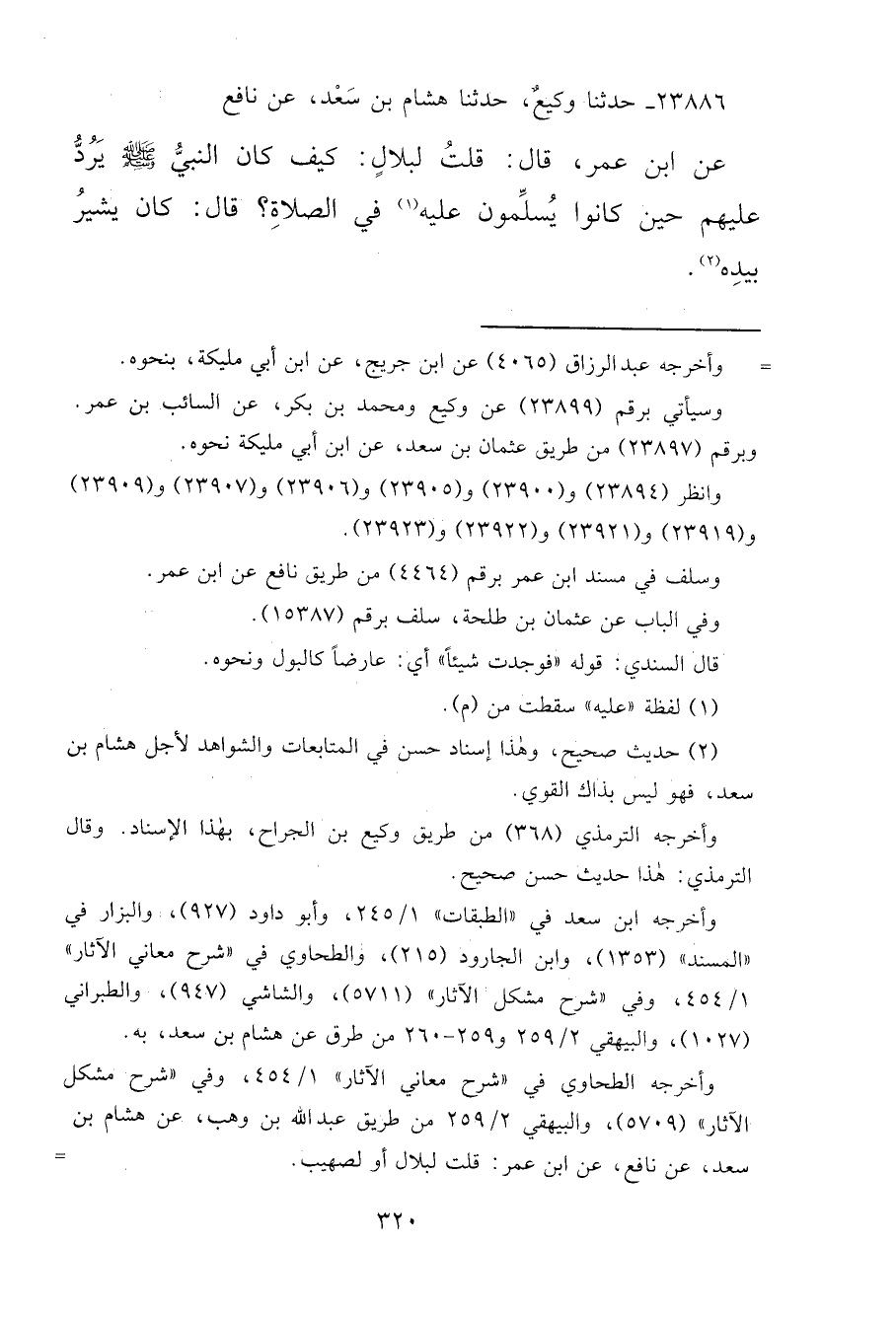 ٢٣٨٨٦ - حَدَّثَنَا وَكِيعٌ، حَدَّثَنَا هِشَامُ بْنُ سَعْدٍ، عَنْ نَافِعٍ، عَنِ ابْنِ عُمَرَ، قَالَ: قُلْتُ لِبِلَالٍ كَيْفَ كَانَ النَّبِيُّ صَلَّى اللهُ عَلَيْهِ وَسَلَّمَ يَرُدُّ عَلَيْهِمْ حِينَ كَانُوا يُسَلِّمُونَ عَلَيْهِ (١) فِي الصَّلَاةِ؟ قَالَ: " كَانَ يُشِيرُ بِيَدِهِ " (٢)