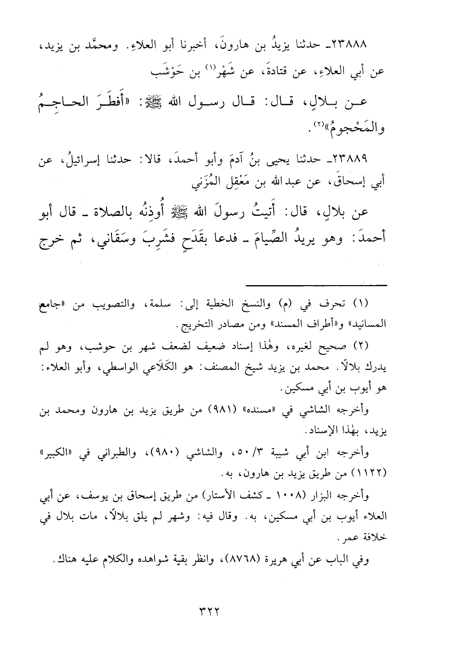 ٢٣٨٨٨ - حَدَّثَنَا يَزِيدُ بْنُ هَارُونَ، أَخْبَرَنَا أَبُو الْعَلَاءِ، وَمُحَمَّدُ بْنُ يَزِيدَ، عَنْ أَبِي الْعَلَاءِ، عَنْ قَتَادَةَ، عَنْ شَهْرِ (١) بْنِ حَوْشَبٍ، عَنْ بِلَالٍ، قَالَ: قَالَ رَسُولُ اللهِ صَلَّى اللهُ عَلَيْهِ وَسَلَّمَ: " أَفْطَرَ الْحَاجِمُ وَالْمَحْجُومُ " (٢)