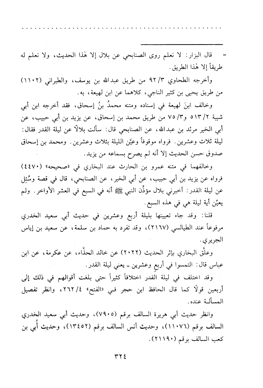 وخالف ابن لهيعة في إسناده ومتنه محمدُ بنُ إسحاق، فقد أخرجه ابن أبي شيبة ٢/٥١٣ و٣/٧٥ من طريق محمد بن إسحاق، عن يزيد بن أبي حبيب، عن أبي الخير مرثد بن عبد الله، عن الصنابحي قال: سألت بلالاً عن ليلة القدر فقال: ليلة ثلاث وعشرين. فرواه موقوفاً وعيَّن الليلة بثلاث وعشرين. ومحمد بن إسحاق صدوق حسن الحديث إلا أنه لم يصرح بسماعه من يزيد.