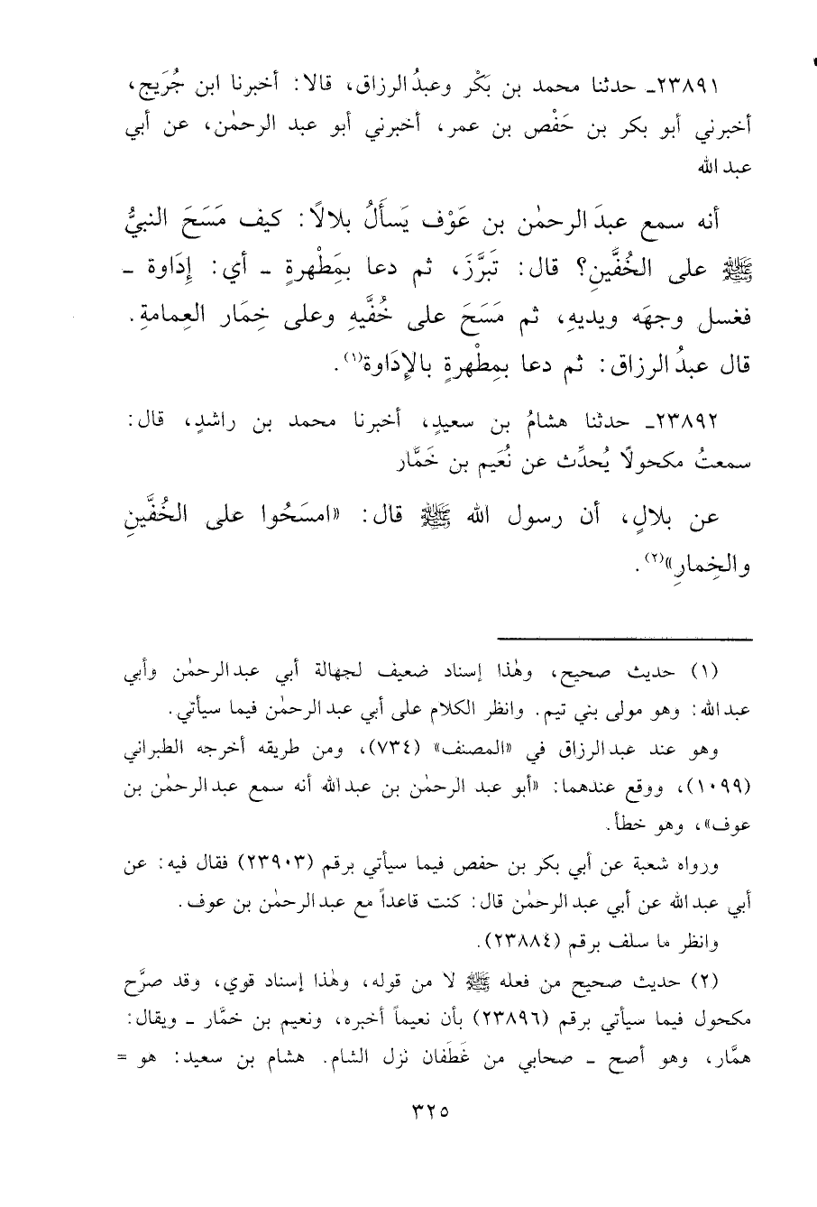 ٢٣٨٩١ - حَدَّثَنَا مُحَمَّدُ بْنُ بَكْرٍ، وَعَبْدُ الرَّزَّاقِ، قَالَا: أَخْبَرَنَا ابْنُ جُرَيْجٍ، أَخْبَرَنِي أَبُو بَكْرِ بْنُ حَفْصِ بْنِ عُمَرَ، أَخْبَرَنِي أَبُو عَبْدِ اللهِ، عَنْ أَبِي عَبْدِ الرَّحْمَنِ أَنَّهُ سَمِعَ عَبْدَ الرَّحْمَنِ بْنَ عَوْفٍ، يَسْأَلُ بِلَالًا كَيْفَ مَسَحَ النَّبِيُّ صَلَّى اللهُ عَلَيْهِ وَسَلَّمَ عَلَى الْخُفَّيْنِ؟ قَالَ: " تَبَرَّزَ ثُمَّ دَعَا بِمِطْهَرَةٍ - أَيْ: إِدَاوَةٍ -، فَغَسَلَ وَجْهَهُ وَيَدَيْهِ، ثُمَّ مَسَحَ عَلَى خُفَّيْهِ وَعَلَى خِمَارِ الْعِمَامَةِ، قَالَ عَبْدُ الرَّزَّاقِ:، ثُمَّ دَعَا بِمِطْهَرَةٍ بِالْإِدَاوَةِ " (١)