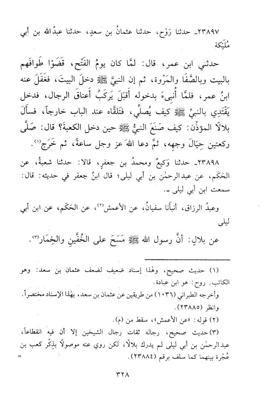 ٢٣٨٩٨ - حَدَّثَنَا وَكِيعٌ، وَمُحَمَّدُ بْنُ جَعْفَرٍ، قَالَا: حَدَّثَنَا شُعْبَةُ، عَنِ الْحَكَمِ، عَنْ عَبْدِ الرَّحْمَنِ بْنِ أَبِي لَيْلَى، قَالَ ابْنُ جَعْفَرٍ فِي حَدِيثِهِ: قَالَ: سَمِعْتُ ابْنَ أَبِي لَيْلَى، وَعَبْدَ الرَّزَّاقِ، أَنْبَأَنَا سُفْيَانُ، عَنِ الْأَعْمَشِ (٢) ، عَنِ الْحَكَمِ، عَنِ ابْنِ أَبِي لَيْلَى، عَنْ بِلَالٍ، أَنَّ رَسُولَ اللهِ صَلَّى اللهُ عَلَيْهِ وَسَلَّمَ " مَسَحَ عَلَى الْخُفَّيْنِ وَالْخِمَارِ " (٣)